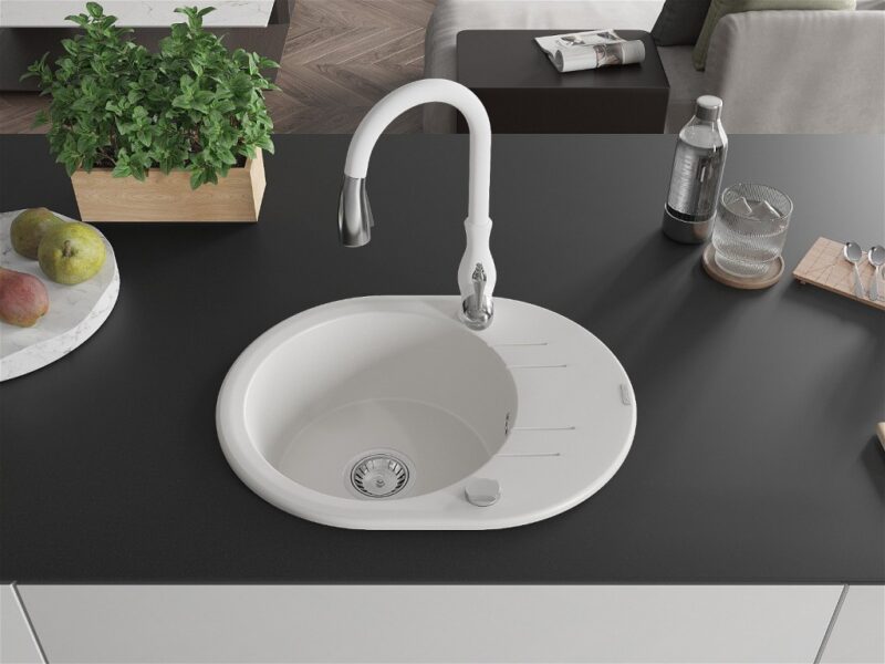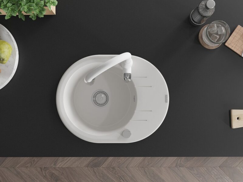 Technické dáta: drez: Rozmer: 586 x 458 x 190 mm Hĺbka komory: 180 mm Rozmery komory: 378×374 mm Priemer odtoku: ø90 mm Typ: 1-miska s krátkym odkvapkávačom Typ: Zapustené do pracovnej dosky biela farba Povrchová úprava sifónu: Chrome Materiál: žula (80% žulové kamenivo, 20% živice) Prepadový otvor: Áno Otvory: (batérie, automatické) 2 Inštalácia: Univerzálna, je možné inštalovať s odkvapkávačom na ľavú alebo pravú stranu Vysoká odolnosť proti poškriabaniu a zmene farby Odolnosť proti tepelným šokom Ľahko čistiteľný povrch Dva dodatočné vyfrézované otvory na samodierovanie ø35 kuchynská batéria: Materiál: mosadz biela farba Hlava: Keramická Prevzdušňovač: Áno Typ: Jedna páka Výška batérie: 410 mm Rozsah výtoku: 231 mm(GT) Ean: 5905315036735