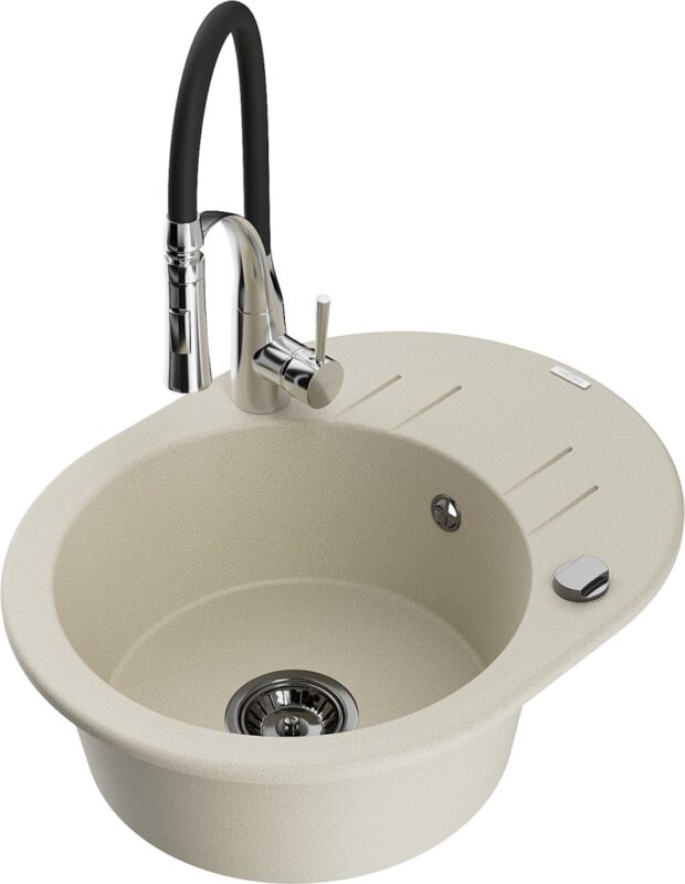 Technické dáta: Drez: Rozmer: 586x458x190 mm Hĺbka komory: 180 mm Šírka komory: 378×374 mm Priemer odtoku: ø90 mm Typ: 1-miska s krátkym odkvapkávačom Typ: Zapustené do pracovnej dosky Farba béžová Povrchová úprava sifónu: čierna Materiál: žula (80% žulové kamenivo 20% živice) Prepadový otvor: Áno Otvory: (batérie, automat) 2 Inštalácia: Univerzálna, je možné inštalovať s odkvapkávačom na ľavú alebo pravú stranu Vysoká odolnosť proti poškriabaniu a zmene farby Odolnosť proti tepelným šokom Povrch pre ľahké čistenie Dva dodatočné vyfrézované otvory na samodierovanie ø35 Kuchynská batéria: Materiál: mosadz Farba: chróm/čierna Hlava: Keramická Perlátor: Áno Typ výtoku: Flexibilný s mosadzným držiakom Typ: Jednopákové Výška batérie: 430 mm Rozsah výtoku: 235 mm(GT) Ean: 5905315048479