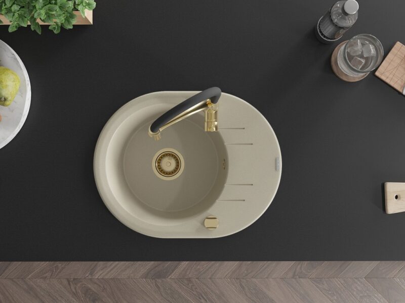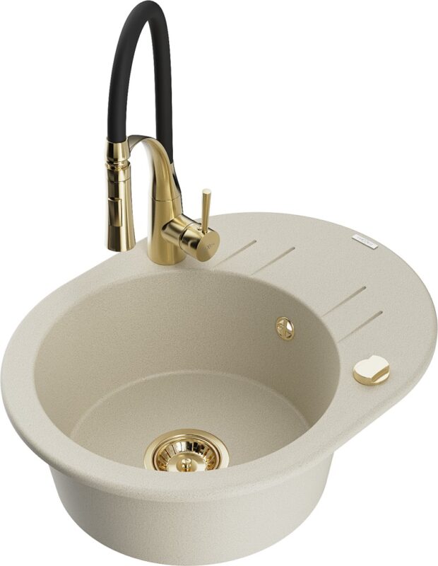 Technické dáta: Drez: Rozmer: 586x458x190 mm Hĺbka komory: 180 mm Šírka komory: 378×374 mm Priemer odtoku: ø90 mm Typ: 1-miska s krátkym odkvapkávačom Typ: Zapustené do pracovnej dosky Farba béžová Povrchová úprava sifónu: zlatá Materiál: žula (80% žulové kamenivo 20% živice) Prepadový otvor: Áno Otvory: (batérie, automat) 2 Inštalácia: Univerzálna, je možné inštalovať s odkvapkávačom na ľavú alebo pravú stranu Vysoká odolnosť proti poškriabaniu a zmene farby Odolnosť proti tepelným šokom Povrch pre ľahké čistenie Dva dodatočné vyfrézované otvory na samodierovanie ø35 Kuchynská batéria: Materiál: mosadz Farba: Zlatá/Čierna Hlava: Keramická Perlátor: Áno Typ výtoku: Flexibilný s mosadzným držiakom Typ: Jednopákové Výška batérie: 430 mm Rozsah výtoku: 235 mm(GT) Ean: 5905315048486