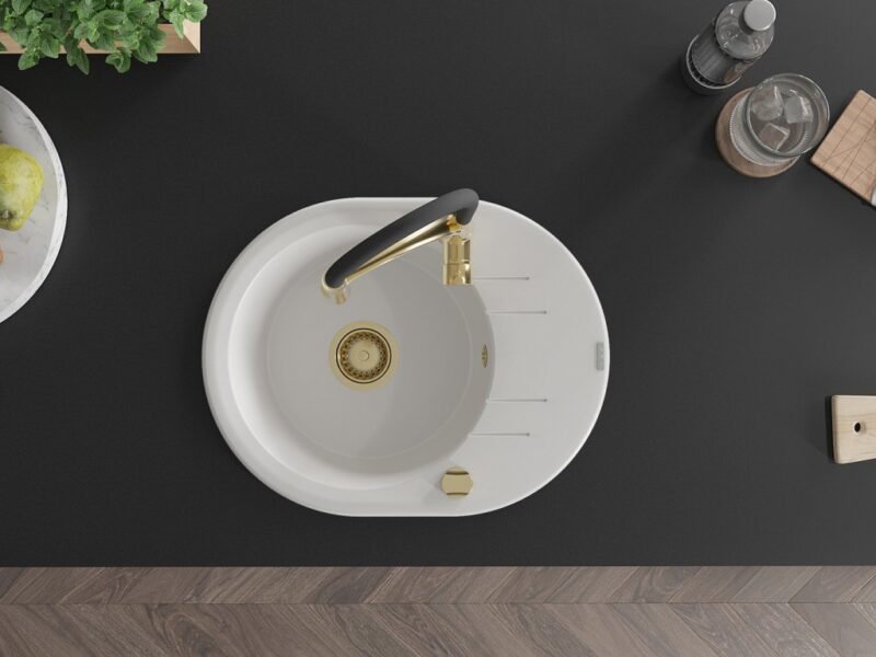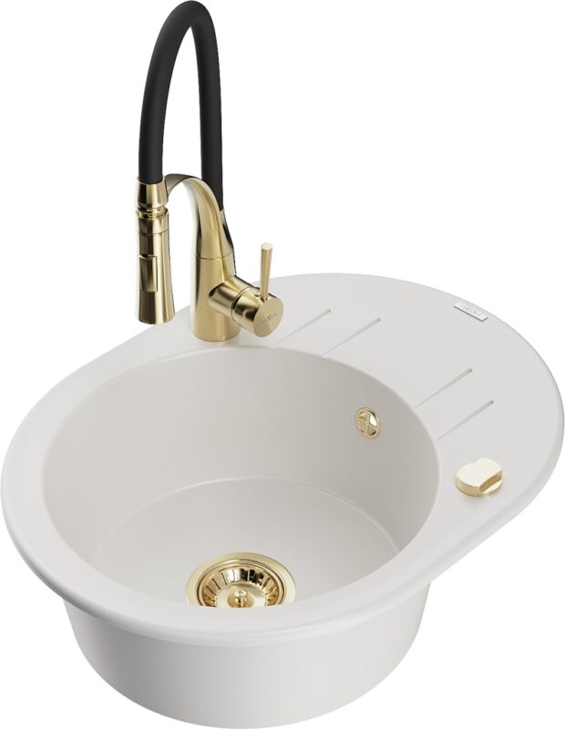 Technické dáta: drez: Rozmer: 586 x 458 x 190 mm Hĺbka komory: 180 mm Šírka komory: 378×374 mm Priemer odtoku: ø90 mm Typ: 1-miska s krátkym odkvapkávačom Typ: Zapustené do pracovnej dosky biela farba Povrchová úprava sifónu: zlatá Materiál: žula (80% žulové kamenivo, 20% živice) Prepadový otvor: Áno Otvory: (batérie, automatické) 2 Inštalácia: Univerzálna, je možné inštalovať s odkvapkávačom na ľavú alebo pravú stranu Vysoká odolnosť proti poškriabaniu a zmene farby Odolnosť proti tepelným šokom Ľahko čistiteľný povrch Dva dodatočné vyfrézované otvory na samodierovanie ø35 kuchynská batéria: Materiál: mosadz Farba: Zlatá/Čierna Hlava: Keramická Prevzdušňovač: Áno Typ hubica: Flexibilný s mosadzným držiakom Typ: Jedna páka Výška batérie: 430 mm Rozsah výtoku: 235 mm(GT) Ean: 5905315048424