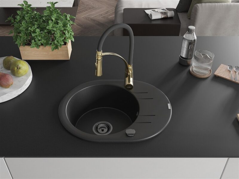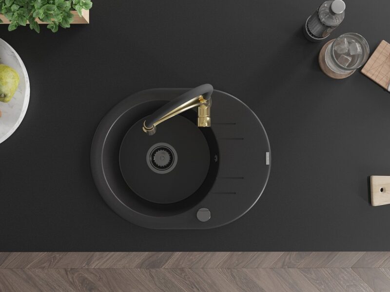 Technické dáta: drez: Rozmer: 586 x 458 x 190 mm Hĺbka komory: 180 mm Šírka komory: 378×374 mm Priemer odtoku: ø90 mm Typ: 1-miska s krátkym odkvapkávačom Typ: Zapustené do pracovnej dosky Čierna farba Povrchová úprava sifónu: čierna Materiál: žula (80% žulové kamenivo, 20% živice) Prepadový otvor: Áno Otvory: (batérie, automatické) 2 Inštalácia: Univerzálna, je možné inštalovať s odkvapkávačom na ľavú alebo pravú stranu Vysoká odolnosť proti poškriabaniu a zmene farby Odolnosť proti tepelným šokom Ľahko čistiteľný povrch Dva dodatočné vyfrézované otvory na samodierovanie ø35 kuchynská batéria: Materiál: mosadz Farba: Zlatá/Čierna Hlava: Keramická Prevzdušňovač: Áno Typ: Jedna páka Výška batérie: 430 mm Rozsah výtoku: 185 mm Batéria má výsuvný výtok(GT) Ean: 5905315048790