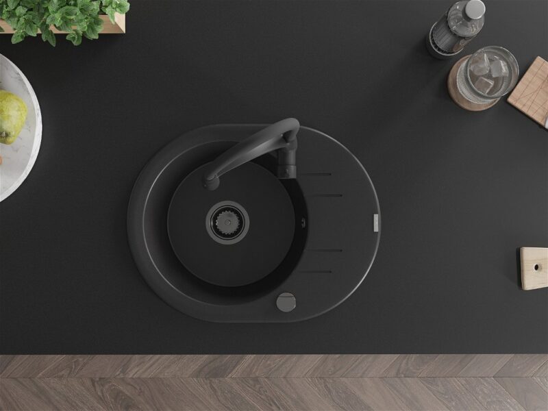 Technické dáta: drez: Rozmer: 586 x 458 x 190 mm Hĺbka komory: 180 mm Šírka komory: 378×374 mm Priemer odtoku: ø90 mm Typ: 1-miska s krátkym odkvapkávačom Typ: Zapustené do pracovnej dosky Čierna farba Povrchová úprava sifónu: čierna Materiál: žula (80% žulové kamenivo, 20% živice) Prepadový otvor: Áno Otvory: (batérie, automatické) 2 Inštalácia: Univerzálna, je možné inštalovať s odkvapkávačom na ľavú alebo pravú stranu Vysoká odolnosť proti poškriabaniu a zmene farby Odolnosť proti tepelným šokom Ľahko čistiteľný povrch Dva dodatočné vyfrézované otvory na samodierovanie ø35 kuchynská batéria: Materiál: mosadz Čierna farba Hlava: Keramická Prevzdušňovač: Áno Typ: Jedna páka Výška batérie: 430 mm Rozsah výtoku: 185 mm Batéria má výsuvný výtok(GT) Ean: 5905315048806