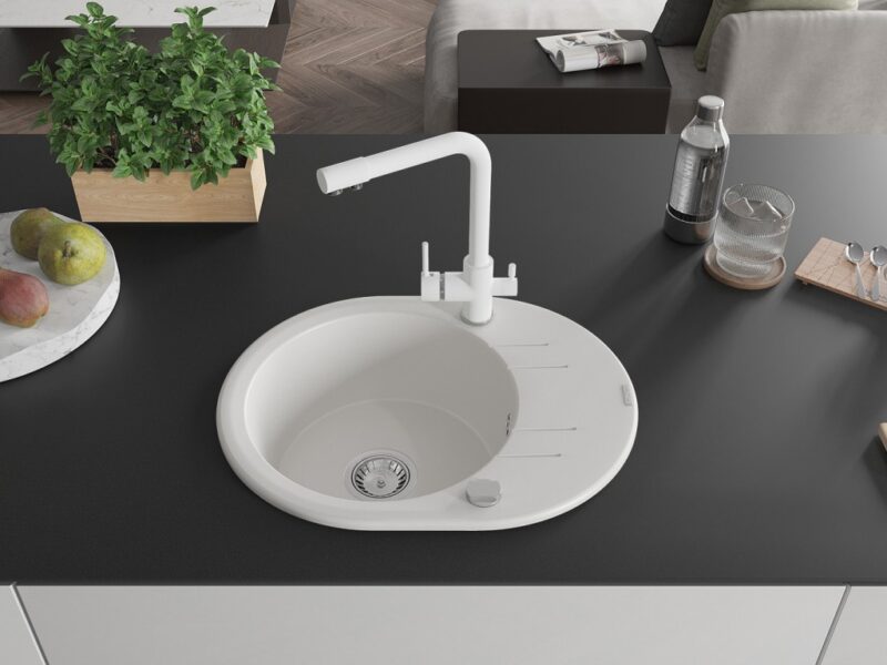 Technické dáta: drez: Rozmer: 586 x 458 x 190 mm Hĺbka komory: 180 mm Šírka komory: 378×374 mm Priemer odtoku: ø90 mm Typ: 1-miska s krátkym odkvapkávačom Typ: Zapustené do pracovnej dosky biela farba Povrchová úprava sifónu: Chrome Materiál: žula (80% žulové kamenivo, 20% živice) Prepadový otvor: Áno Otvory: (batérie, automatické) 2 Inštalácia: Univerzálna, je možné inštalovať s odkvapkávačom na ľavú alebo pravú stranu Vysoká odolnosť proti poškriabaniu a zmene farby Odolnosť proti tepelným šokom Ľahko čistiteľný povrch Dva dodatočné vyfrézované otvory na samodierovanie ø35 kuchynská batéria: Materiál: mosadz biela farba Hlava: Keramická Prevzdušňovač: Áno Typ: Dve rukoväte Rozsah výtoku: 235 mm Výška batérie: 315 mm Dvojhlavá batéria s prídavným kanálom pre filtrovanú pitnú vodu(GT) Ean: 5905315026507