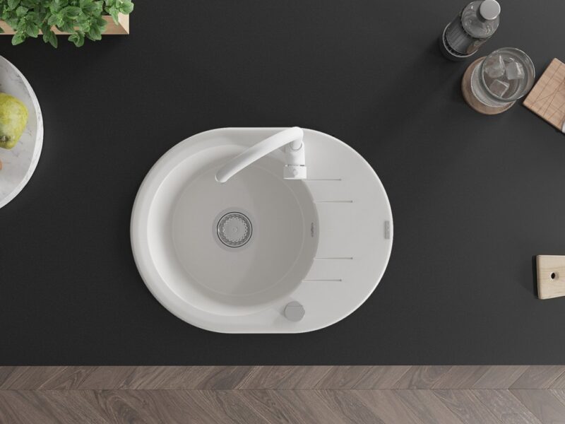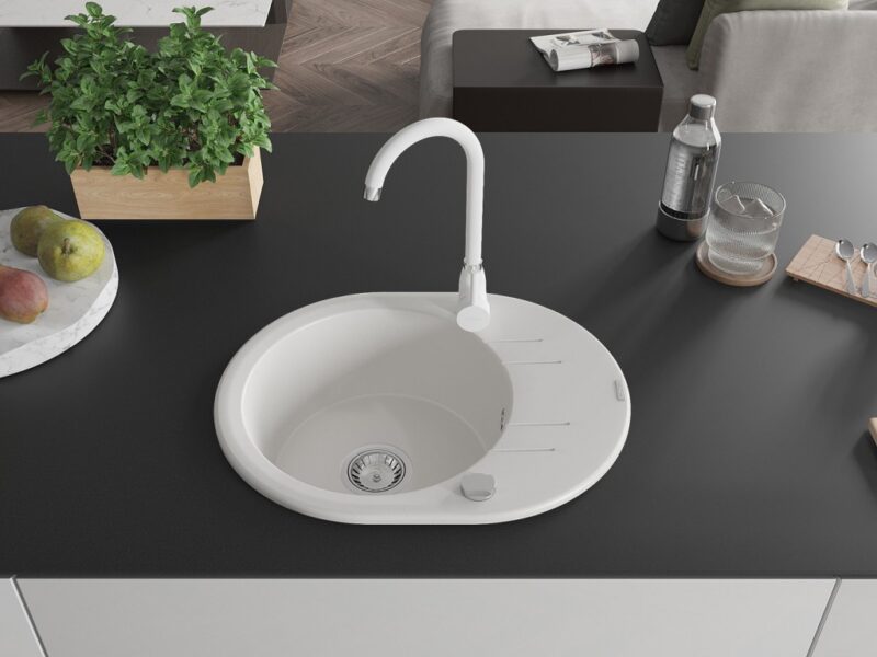 Technické dáta: drez: Rozmer: 586 x 458 x 190 mm Hĺbka komory: 180 mm Šírka komory: 378×374 mm Priemer odtoku: ø90 mm Typ: 1-miska s krátkym odkvapkávačom Typ: Zapustené do pracovnej dosky biela farba Povrchová úprava sifónu: Chrome Materiál: žula (80% žulové kamenivo, 20% živice) Prepadový otvor: Áno Otvory: (batérie, automatické) 2 Inštalácia: Univerzálna, je možné inštalovať s odkvapkávačom na ľavú alebo pravú stranu Vysoká odolnosť proti poškriabaniu a zmene farby Odolnosť proti tepelným šokom Ľahko čistiteľný povrch Jeden dodatočný vyfrézovaný otvor na samodierovanie ø35 kuchynská batéria: Materiál: mosadz biela farba Hlava: Keramická Prevzdušňovač: Áno Typ: Jedna páka Výška batérie: 335 mm Rozsah výtoku: 180 mm(GT) Ean: 5905315016263