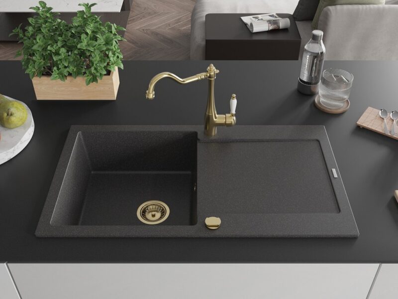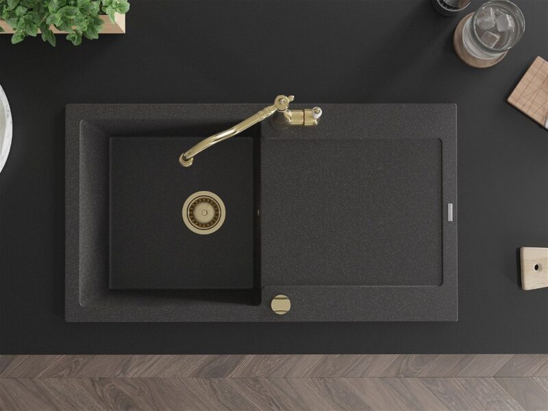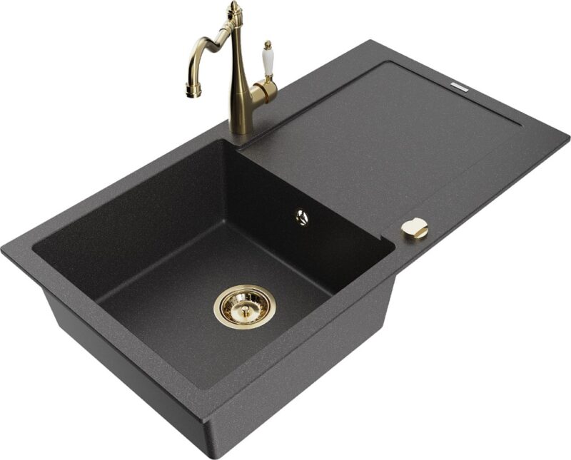 Technické dáta: drez: Rozmer: 900x500x190mm Hĺbka komory: 180 mm Rozmery komory: 430×415 mm Priemer odtoku: ø90 mm Typ: 1-miska s odkvapkávačom Typ: Zapustené do pracovnej dosky Farba: Škvrnitá čierna Povrchová úprava sifónu: zlatá Materiál: žula (80% žulové kamenivo, 20% živice) Prepadový otvor: Áno Otvory: (batérie, automatické) 2 Inštalácia: Univerzálna, je možné inštalovať s odkvapkávačom na ľavú alebo pravú stranu Vysoká odolnosť proti poškriabaniu a zmene farby Odolnosť proti tepelným šokom Ľahko čistiteľný povrch Dva dodatočné vyfrézované otvory na samodierovanie ø35 kuchynská batéria: Materiál: mosadz Farba: Zlatá Hlava: Keramická Prevzdušňovač: Áno Typ: Jedna páka Výška batérie: 290 mm Rozsah výtoku: 260 mm(GT) Ean: 5905315037619