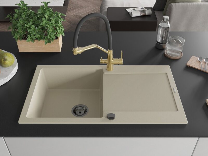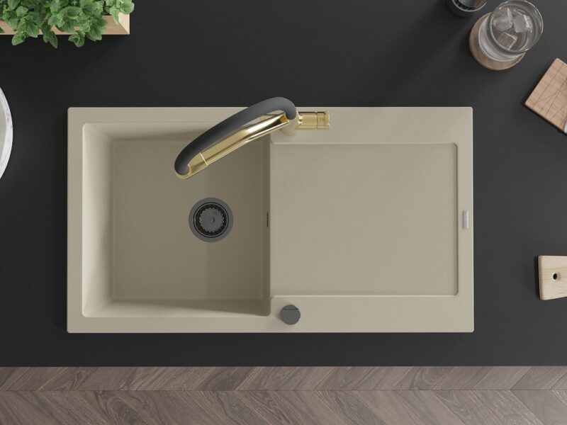 Technické dáta: drez: Rozmer: 900x500x190mm Hĺbka komory: 180 mm Rozmery komory: 430×415 mm Priemer odtoku: ø90 mm Typ: 1-miska s odkvapkávačom Typ: Zapustené do pracovnej dosky Farba béžová Povrchová úprava sifónu: čierna Materiál: žula (80% žulové kamenivo, 20% živice) Prepadový otvor: Áno Otvory: (batérie, automatické) 2 Inštalácia: Univerzálna, je možné inštalovať s odkvapkávačom na ľavú alebo pravú stranu Vysoká odolnosť proti poškriabaniu a zmene farby Odolnosť proti tepelným šokom Ľahko čistiteľný povrch Dva dodatočné vyfrézované otvory na samodierovanie ø35 kuchynská batéria: Materiál: mosadz Povrchová úprava: zlatá/čierna Hlavy: Keramické Prevzdušňovač: Áno Typ hubica: Flexibilný s mosadzným držiakom Rozsah výtoku: 260 mm Výška: 405 mm Typ: Dve rukoväte Dvojhlavá batéria s prídavným kanálom pre filtrovanú pitnú vodu(GT) Ean: 5905315049339