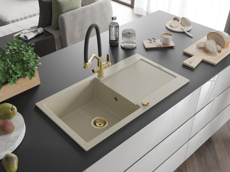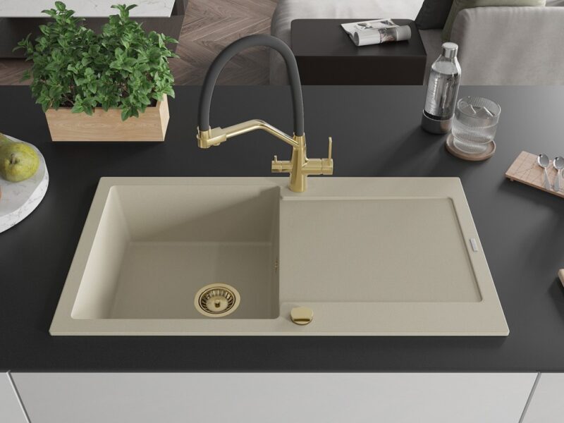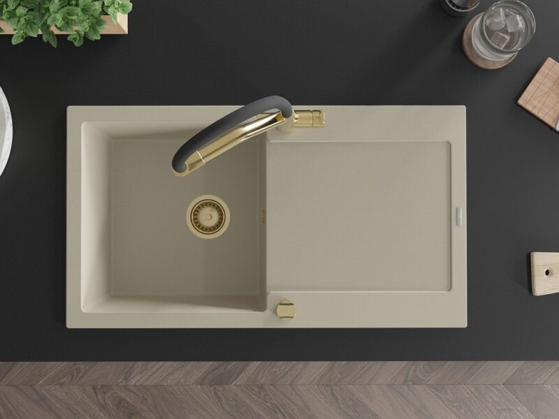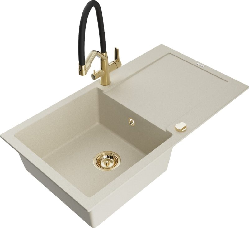 Technické dáta: drez: Rozmer: 900x500x190mm Hĺbka komory: 180 mm Rozmery komory: 430×415 mm Priemer odtoku: ø90 mm Typ: 1-miska s odkvapkávačom Typ: Zapustené do pracovnej dosky Farba béžová Povrchová úprava sifónu: zlatá Materiál: žula (80% žulové kamenivo, 20% živice) Prepadový otvor: Áno Otvory: (batérie, automatické) 2 Inštalácia: Univerzálna, je možné inštalovať s odkvapkávačom na ľavú alebo pravú stranu Vysoká odolnosť proti poškriabaniu a zmene farby Odolnosť proti tepelným šokom Ľahko čistiteľný povrch Dva dodatočné vyfrézované otvory na samodierovanie ø35 kuchynská batéria: Materiál: mosadz Povrchová úprava: zlatá/čierna Hlavy: Keramické Prevzdušňovač: Áno Typ hubica: Flexibilný s mosadzným držiakom Rozsah výtoku: 260 mm Výška: 405 mm Typ: Dve rukoväte Dvojhlavá batéria s prídavným kanálom pre filtrovanú pitnú vodu(GT) Ean: 5905315049322