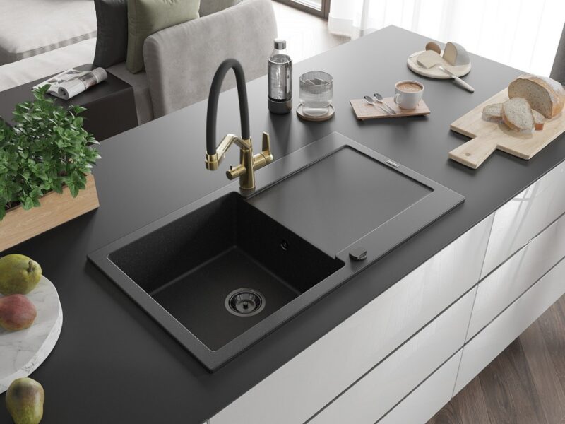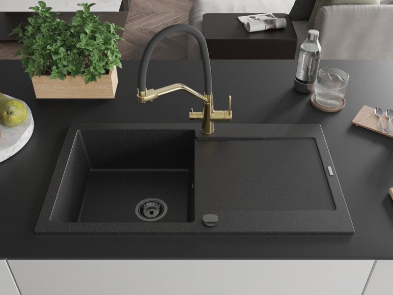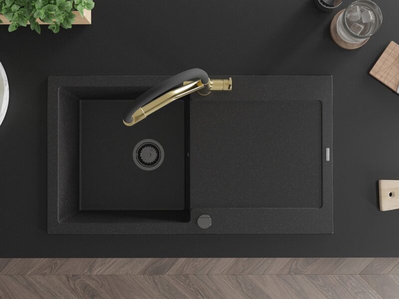 Technické dáta: drez: Rozmer: 900x500x190mm Hĺbka komory: 180 mm Rozmery komory: 430×415 mm Priemer odtoku: ø90 mm Typ: 1-miska s odkvapkávačom Typ: Zapustené do pracovnej dosky Farba: čierna/strieborná metalíza Povrchová úprava sifónu: čierna Materiál: žula (80% žulové kamenivo, 20% živice) Prepadový otvor: Áno Otvory: (batérie, automatické) 2 Inštalácia: Univerzálna, je možné inštalovať s odkvapkávačom na ľavú alebo pravú stranu Vysoká odolnosť proti poškriabaniu a zmene farby Odolnosť proti tepelným šokom Ľahko čistiteľný povrch Dva dodatočné vyfrézované otvory na samodierovanie ø35 kuchynská batéria: Materiál: mosadz Povrchová úprava: zlatá/čierna Hlavy: Keramické Prevzdušňovač: Áno Typ hubica: Flexibilný s mosadzným držiakom Rozsah výtoku: 260 mm Výška: 405 mm Typ: Dve rukoväte Dvojhlavá batéria s prídavným kanálom pre filtrovanú pitnú vodu(GT) Ean: 5905315049452