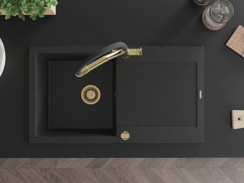 Technické dáta: drez: Rozmer: 900x500x190mm Hĺbka komory: 180 mm Rozmery komory: 430×415 mm Priemer odtoku: ø90 mm Typ: 1-miska s odkvapkávačom Typ: Zapustené do pracovnej dosky Farba: čierna/strieborná metalíza Povrchová úprava sifónu: zlatá Materiál: žula (80% žulové kamenivo, 20% živice) Prepadový otvor: Áno Otvory: (batérie, automatické) 2 Inštalácia: Univerzálna, je možné inštalovať s odkvapkávačom na ľavú alebo pravú stranu Vysoká odolnosť proti poškriabaniu a zmene farby Odolnosť proti tepelným šokom Ľahko čistiteľný povrch Dva dodatočné vyfrézované otvory na samodierovanie ø35 kuchynská batéria: Materiál: mosadz Povrchová úprava: zlatá/čierna Hlavy: Keramické Prevzdušňovač: Áno Typ hubica: Flexibilný s mosadzným držiakom Rozsah výtoku: 260 mm Výška: 405 mm Typ: Dve rukoväte Dvojhlavá batéria s prídavným kanálom pre filtrovanú pitnú vodu(GT) Ean: 5905315049445