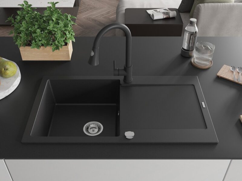 Technické dáta: drez: Rozmer: 900x500x190mm Hĺbka komory: 180 mm Rozmery komory: 430×415 mm Priemer odtoku: ø90 mm Typ: 1-miska s odkvapkávačom Typ: Zapustené do pracovnej dosky Čierna farba Povrchová úprava sifónu: Chrome Materiál: žula (80% žulové kamenivo, 20% živice) Prepadový otvor: Áno Otvory: (batérie, automatické) 2 Inštalácia: Univerzálna, je možné inštalovať s odkvapkávačom na ľavú alebo pravú stranu Vysoká odolnosť proti poškriabaniu a zmene farby Odolnosť proti tepelným šokom Ľahko čistiteľný povrch Dva dodatočné vyfrézované otvory na samodierovanie ø35 kuchynská batéria: Materiál: mosadz Čierna farba Hlava: Keramická Prevzdušňovač: Áno Typ: Jedna páka Výška batérie: 380 mm Rozsah výtoku: 252 mm Typ výtoku: Výsuvný(GT) Ean: 5905315027436