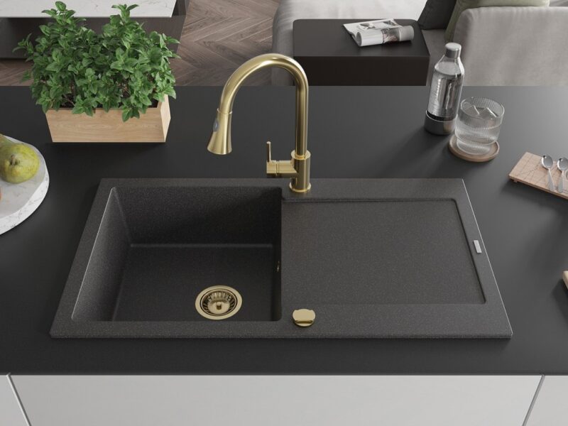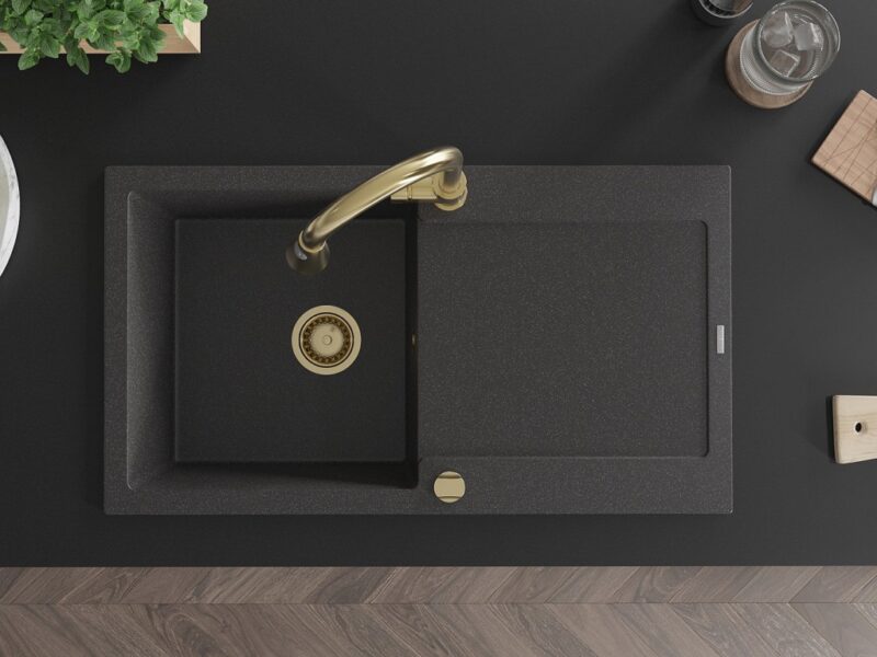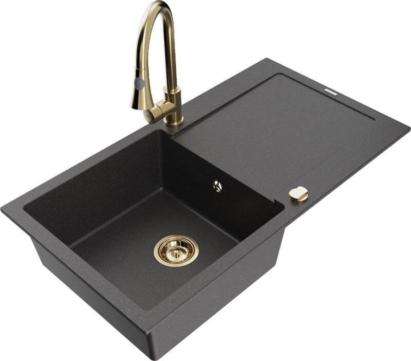 Technické dáta: drez: Rozmer: 900x500x190mm Hĺbka komory: 180 mm Rozmery komory: 430×415 mm Priemer odtoku: ø90 mm Typ: 1-miska s odkvapkávačom Typ: Zapustené do pracovnej dosky Farba: Škvrnitá čierna Povrchová úprava sifónu: zlatá Materiál: žula (80% žulové kamenivo, 20% živice) Prepadový otvor: Áno Otvory: (batérie, automatické) 2 Inštalácia: Univerzálna, je možné inštalovať s odkvapkávačom na ľavú alebo pravú stranu Vysoká odolnosť proti poškriabaniu a zmene farby Odolnosť proti tepelným šokom Ľahko čistiteľný povrch Dva dodatočné vyfrézované otvory na samodierovanie ø35 kuchynská batéria: Materiál: mosadz Farba: Zlatá Hlava: Keramická Prevzdušňovač: Áno Typ: Jedna páka Výška batérie: 380 mm Rozsah výtoku: 252 mm Typ výtoku: Výsuvný(GT) Ean: 5905315027368
