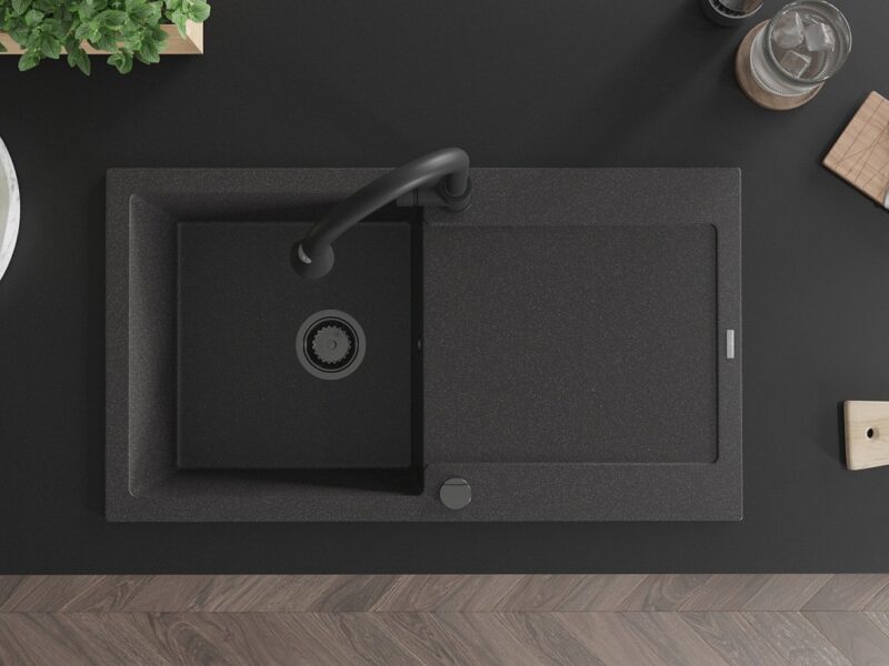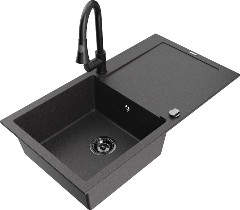 Technické dáta: drez: Rozmer: 900x500x190mm Hĺbka komory: 180 mm Rozmery komory: 430×415 mm Priemer odtoku: ø90 mm Typ: 1-miska s odkvapkávačom Typ: Zapustené do pracovnej dosky Farba: Škvrnitá čierna Povrchová úprava sifónu: čierna Materiál: žula (80% žulové kamenivo, 20% živice) Prepadový otvor: Áno Otvory: (batérie, automatické) 2 Inštalácia: Univerzálna, je možné inštalovať s odkvapkávačom na ľavú alebo pravú stranu Vysoká odolnosť proti poškriabaniu a zmene farby Odolnosť proti tepelným šokom Ľahko čistiteľný povrch Dva dodatočné vyfrézované otvory na samodierovanie ø35 kuchynská batéria: Materiál: mosadz Čierna farba Hlava: Keramická Prevzdušňovač: Áno Typ: Jedna páka Výška batérie: 380 mm Rozsah výtoku: 252 mm Typ výtoku: Výsuvný(GT) Ean: 5905315027382
