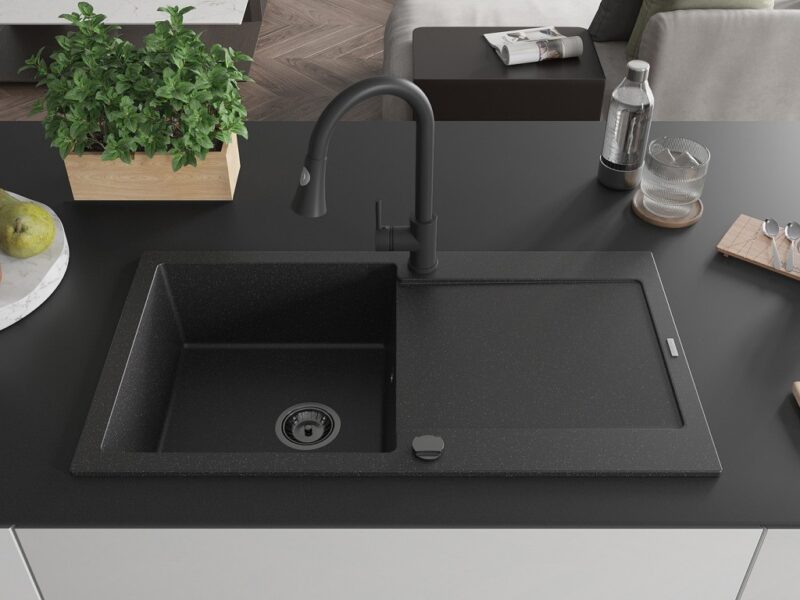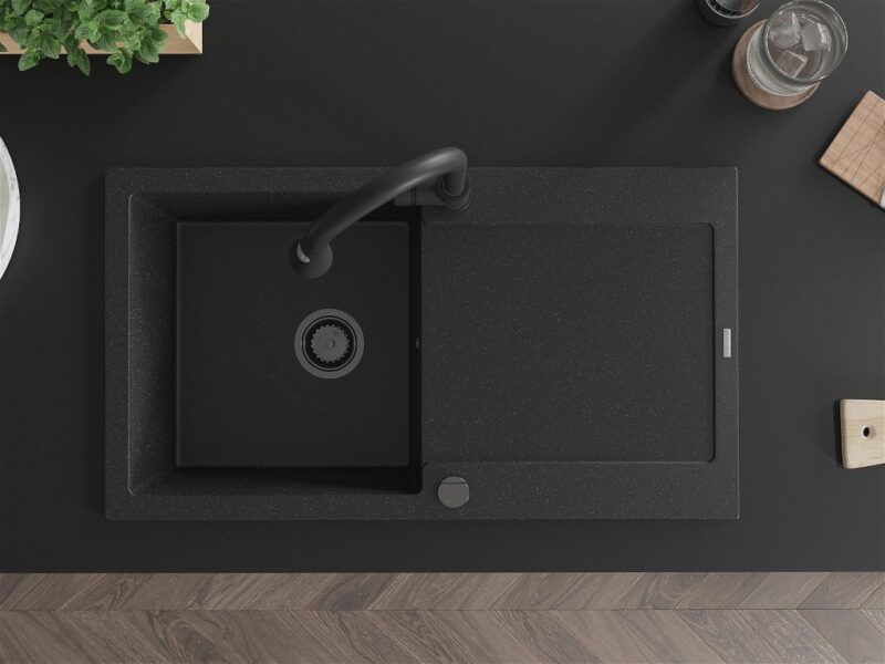 Technické dáta: drez: Rozmer: 900x500x190mm Hĺbka komory: 180 mm Rozmery komory: 430×415 mm Priemer odtoku: ø90 mm Typ: 1-miska s odkvapkávačom Typ: Zapustené do pracovnej dosky Farba: čierna/strieborná metalíza Povrchová úprava sifónu: čierna Materiál: žula (80% žulové kamenivo, 20% živice) Prepadový otvor: Áno Otvory: (batérie, automatické) 2 Inštalácia: Univerzálna, je možné inštalovať s odkvapkávačom na ľavú alebo pravú stranu Vysoká odolnosť proti poškriabaniu a zmene farby Odolnosť proti tepelným šokom Ľahko čistiteľný povrch Dva dodatočné vyfrézované otvory na samodierovanie ø35 kuchynská batéria: Materiál: mosadz Čierna farba Hlava: Keramická Prevzdušňovač: Áno Typ: Jedna páka Výška batérie: 380 mm Rozsah výtoku: 252 mm Typ výtoku: Výsuvný(GT) Ean: 5905315027283