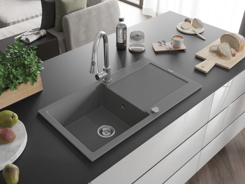 Technické dáta: drez: Rozmer: 900x500x190mm Hĺbka komory: 180 mm Rozmery komory: 430×415 mm Priemer odtoku: ø90 mm Typ: 1-miska s odkvapkávačom Typ: Zapustené do pracovnej dosky Šedá farba Povrchová úprava sifónu: Chrome Materiál: žula (80% žulové kamenivo, 20% živice) Prepadový otvor: Áno Otvory: (batérie, automatické) 2 Inštalácia: Univerzálna, je možné inštalovať s odkvapkávačom na ľavú alebo pravú stranu Vysoká odolnosť proti poškriabaniu a zmene farby Odolnosť proti tepelným šokom Ľahko čistiteľný povrch Dva dodatočné vyfrézované otvory na samodierovanie ø35 kuchynská batéria: Materiál: mosadz Farba: Chrome Hlava: Keramická Prevzdušňovač: Áno Typ: Jedna páka Výška batérie: 380 mm Rozsah výtoku: 252 mm Typ výtoku: Výsuvný(GT) Ean: 5905315027214
