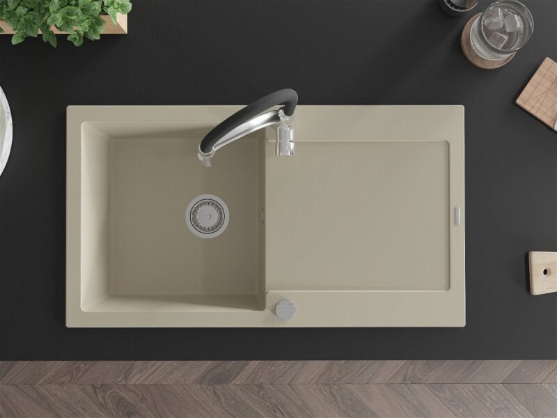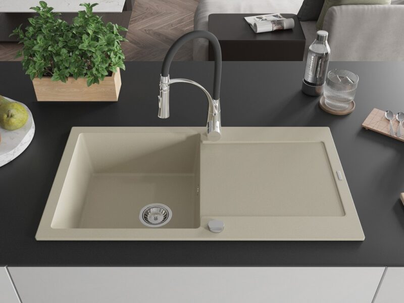 Technické dáta: drez: Rozmer: 900x500x190mm Hĺbka komory: 180 mm Rozmery komory: 430×415 mm Priemer odtoku: ø90 mm Typ: 1-miska s odkvapkávačom Typ: Zapustené do pracovnej dosky Farba béžová Povrchová úprava sifónu: Chrome Materiál: žula (80% žulové kamenivo, 20% živice) Prepadový otvor: Áno Otvory: (batérie, automatické) 2 Inštalácia: Univerzálna, je možné inštalovať s odkvapkávačom na ľavú alebo pravú stranu Vysoká odolnosť proti poškriabaniu a zmene farby Odolnosť proti tepelným šokom Ľahko čistiteľný povrch Dva dodatočné vyfrézované otvory na samodierovanie ø35 kuchynská batéria: Materiál: mosadz Farba: chróm/čierna Hlava: Keramická Prevzdušňovač: Áno Typ: Jedna páka Výška batérie: 430 mm Rozsah výtoku: 185 mm Batéria má výsuvný výtok(GT) Ean: 5905315042583