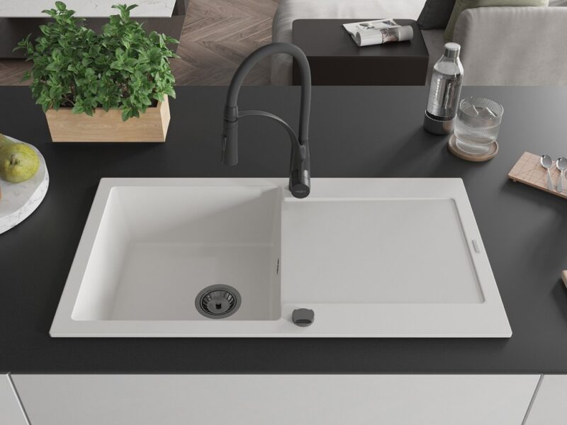 Technické dáta: drez: Rozmer: 900x500x190mm Hĺbka komory: 180 mm Rozmery komory: 430×415 mm Priemer odtoku: ø90 mm Typ: 1-miska s odkvapkávačom Typ: Zapustené do pracovnej dosky biela farba Povrchová úprava sifónu: čierna Materiál: žula (80% žulové kamenivo, 20% živice) Prepadový otvor: Áno Otvory: (batérie, automatické) 2 Inštalácia: Univerzálna, je možné inštalovať s odkvapkávačom na ľavú alebo pravú stranu Vysoká odolnosť proti poškriabaniu a zmene farby Odolnosť proti tepelným šokom Ľahko čistiteľný povrch Dva dodatočné vyfrézované otvory na samodierovanie ø35 kuchynská batéria: Materiál: mosadz Čierna farba Hlava: Keramická Prevzdušňovač: Áno Typ: Jedna páka Výška batérie: 430 mm Rozsah výtoku: 185 mm Batéria má výsuvný výtok(GT) Ean: 5905315042569
