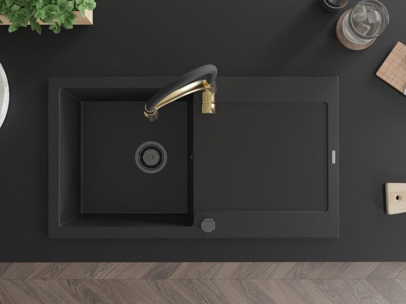 Technické dáta: drez: Rozmer: 900x500x190mm Hĺbka komory: 180 mm Rozmery komory: 430×415 mm Priemer odtoku: ø90 mm Typ: 1-miska s odkvapkávačom Typ: Zapustené do pracovnej dosky Čierna farba Povrchová úprava sifónu: čierna Materiál: žula (80% žulové kamenivo, 20% živice) Prepadový otvor: Áno Otvory: (batérie, automatické) 2 Inštalácia: Univerzálna, je možné inštalovať s odkvapkávačom na ľavú alebo pravú stranu Vysoká odolnosť proti poškriabaniu a zmene farby Odolnosť proti tepelným šokom Ľahko čistiteľný povrch Dva dodatočné vyfrézované otvory na samodierovanie ø35 kuchynská batéria: Materiál: mosadz Farba: Zlatá/Čierna Hlava: Keramická Prevzdušňovač: Áno Typ: Jedna páka Výška batérie: 430 mm Rozsah výtoku: 185 mm Batéria má výsuvný výtok(GT) Ean: 5905315042910