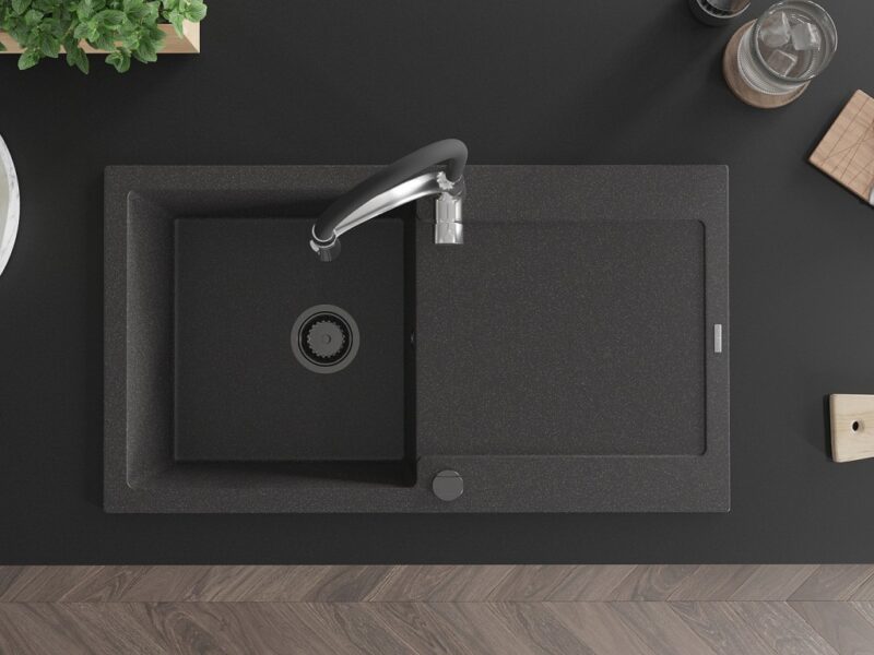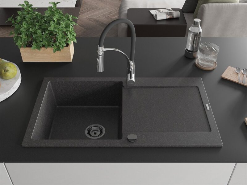 Technické dáta: drez: Rozmer: 900x500x190mm Hĺbka komory: 180 mm Rozmery komory: 430×415 mm Priemer odtoku: ø90 mm Typ: 1-miska s odkvapkávačom Typ: Zapustené do pracovnej dosky Farba: Škvrnitá čierna Povrchová úprava sifónu: čierna Materiál: žula (80% žulové kamenivo, 20% živice) Prepadový otvor: Áno Otvory: (batérie, automatické) 2 Inštalácia: Univerzálna, je možné inštalovať s odkvapkávačom na ľavú alebo pravú stranu Vysoká odolnosť proti poškriabaniu a zmene farby Odolnosť proti tepelným šokom Ľahko čistiteľný povrch Dva dodatočné vyfrézované otvory na samodierovanie ø35 kuchynská batéria: Materiál: mosadz Farba: chróm/čierna Hlava: Keramická Prevzdušňovač: Áno Typ: Jedna páka Výška batérie: 430 mm Rozsah výtoku: 185 mm Batéria má výsuvný výtok(GT) Ean: 5905315042835