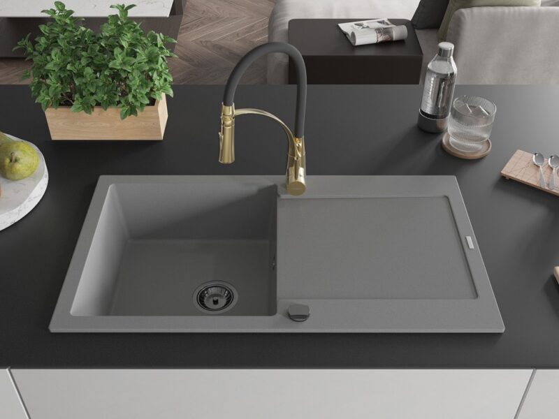 Technické dáta: drez: Rozmer: 900x500x190mm Hĺbka komory: 180 mm Rozmery komory: 430×415 mm Priemer odtoku: ø90 mm Typ: 1-miska s odkvapkávačom Typ: Zapustené do pracovnej dosky Šedá farba Povrchová úprava sifónu: čierna Materiál: žula (80% žulové kamenivo, 20% živice) Prepadový otvor: Áno Otvory: (batérie, automatické) 2 Inštalácia: Univerzálna, je možné inštalovať s odkvapkávačom na ľavú alebo pravú stranu Vysoká odolnosť proti poškriabaniu a zmene farby Odolnosť proti tepelným šokom Ľahko čistiteľný povrch Dva dodatočné vyfrézované otvory na samodierovanie ø35 kuchynská batéria: Materiál: mosadz Farba: Zlatá/Čierna Hlava: Keramická Prevzdušňovač: Áno Typ: Jedna páka Výška batérie: 430 mm Rozsah výtoku: 185 mm Batéria má výsuvný výtok(GT) Ean: 5905315042675