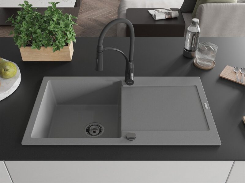 Technické dáta: drez: Rozmer: 900x500x190mm Hĺbka komory: 180 mm Rozmery komory: 430×415 mm Priemer odtoku: ø90 mm Typ: 1-miska s odkvapkávačom Typ: Zapustené do pracovnej dosky Šedá farba Povrchová úprava sifónu: čierna Materiál: žula (80% žulové kamenivo, 20% živice) Prepadový otvor: Áno Otvory: (batérie, automatické) 2 Inštalácia: Univerzálna, je možné inštalovať s odkvapkávačom na ľavú alebo pravú stranu Vysoká odolnosť proti poškriabaniu a zmene farby Odolnosť proti tepelným šokom Ľahko čistiteľný povrch Dva dodatočné vyfrézované otvory na samodierovanie ø35 kuchynská batéria: Materiál: mosadz Čierna farba Hlava: Keramická Prevzdušňovač: Áno Typ: Jedna páka Výška batérie: 430 mm Rozsah výtoku: 185 mm Batéria má výsuvný výtok(GT) Ean: 5905315042682