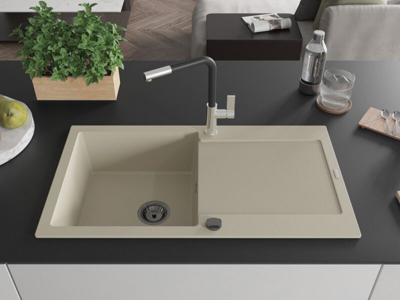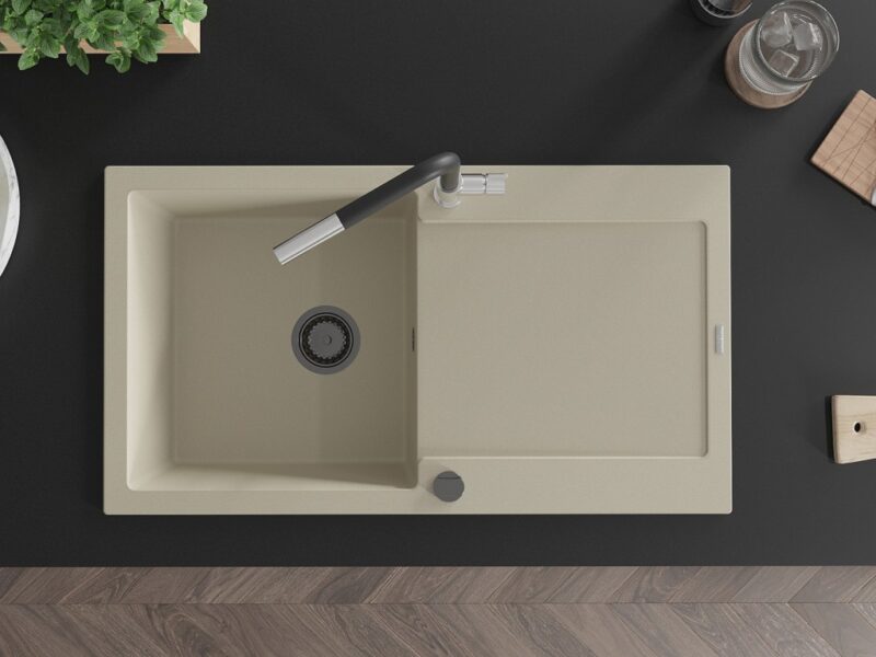 Technické dáta: drez: Rozmer: 900x500x190mm Hĺbka komory: 180 mm Rozmery komory: 430×415 mm Priemer odtoku: ø90 mm Typ: 1-miska s odkvapkávačom Typ: Zapustené do pracovnej dosky Farba béžová Povrchová úprava sifónu: čierna Materiál: žula (80% žulové kamenivo, 20% živice) Prepadový otvor: Áno Otvory: (batérie, automatické) 2 Inštalácia: Univerzálna, je možné inštalovať s odkvapkávačom na ľavú alebo pravú stranu Vysoká odolnosť proti poškriabaniu a zmene farby Odolnosť proti tepelným šokom Ľahko čistiteľný povrch Dva dodatočné vyfrézované otvory na samodierovanie ø35 kuchynská batéria: Materiál: mosadz Farba: chróm/čierna Hlava: Keramická Prevzdušňovač: Áno Typ: Jedna páka Rozsah výtoku: 245 mm Výška batérie: 307 mm(GT) Ean: 5905315056054