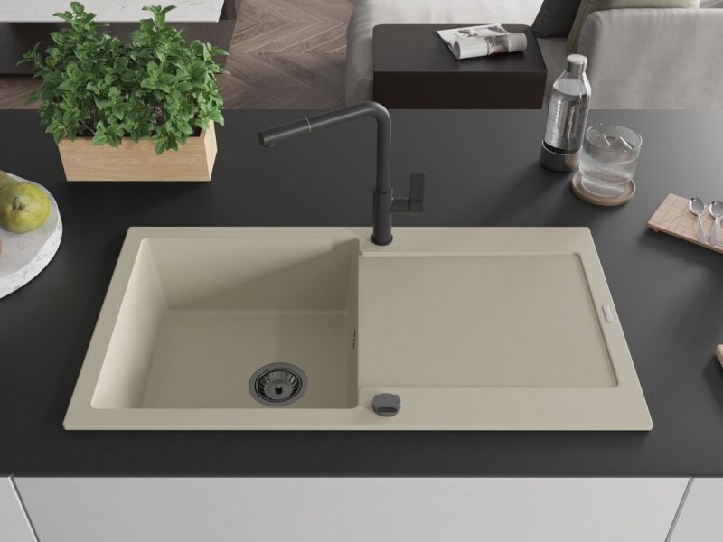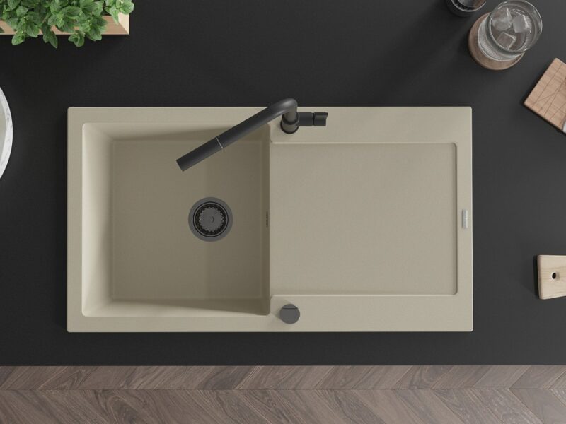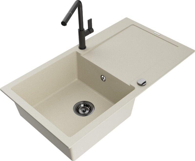 Technické dáta: drez: Rozmer: 900x500x190mm Hĺbka komory: 180 mm Rozmery komory: 430×415 mm Priemer odtoku: ø90 mm Typ: 1-miska s odkvapkávačom Typ: Zapustené do pracovnej dosky Farba béžová Povrchová úprava sifónu: čierna Materiál: žula (80% žulové kamenivo, 20% živice) Prepadový otvor: Áno Otvory: (batérie, automatické) 2 Inštalácia: Univerzálna, je možné inštalovať s odkvapkávačom na ľavú alebo pravú stranu Vysoká odolnosť proti poškriabaniu a zmene farby Odolnosť proti tepelným šokom Ľahko čistiteľný povrch Dva dodatočné vyfrézované otvory na samodierovanie ø35 kuchynská batéria: Materiál: mosadz Čierna farba Hlava: Keramická Prevzdušňovač: Áno Typ: Jedna páka Rozsah výtoku: 245 mm Výška batérie: 307 mm(GT) Ean: 5905315056092