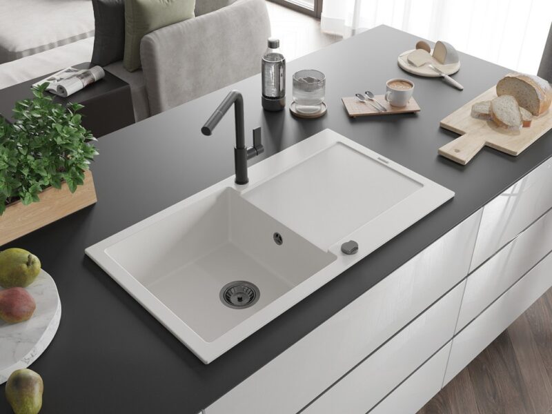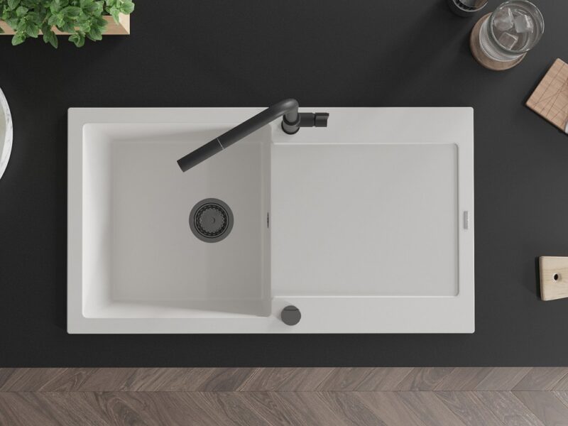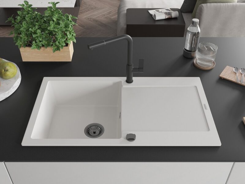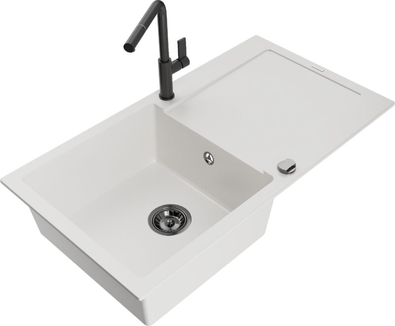 Technické dáta: drez: Rozmer: 900x500x190mm Hĺbka komory: 180 mm Rozmery komory: 430×415 mm Priemer odtoku: ø90 mm Typ: 1-miska s odkvapkávačom Typ: Zapustené do pracovnej dosky biela farba Povrchová úprava sifónu: čierna Materiál: žula (80% žulové kamenivo, 20% živice) Prepadový otvor: Áno Otvory: (batérie, automatické) 2 Inštalácia: Univerzálna, je možné inštalovať s odkvapkávačom na ľavú alebo pravú stranu Vysoká odolnosť proti poškriabaniu a zmene farby Odolnosť proti tepelným šokom Ľahko čistiteľný povrch Dva dodatočné vyfrézované otvory na samodierovanie ø35 kuchynská batéria: Materiál: mosadz Čierna farba Hlava: Keramická Prevzdušňovač: Áno Typ: Jedna páka Rozsah výtoku: 245 mm Výška batérie: 307 mm(GT) Ean: 5905315056023