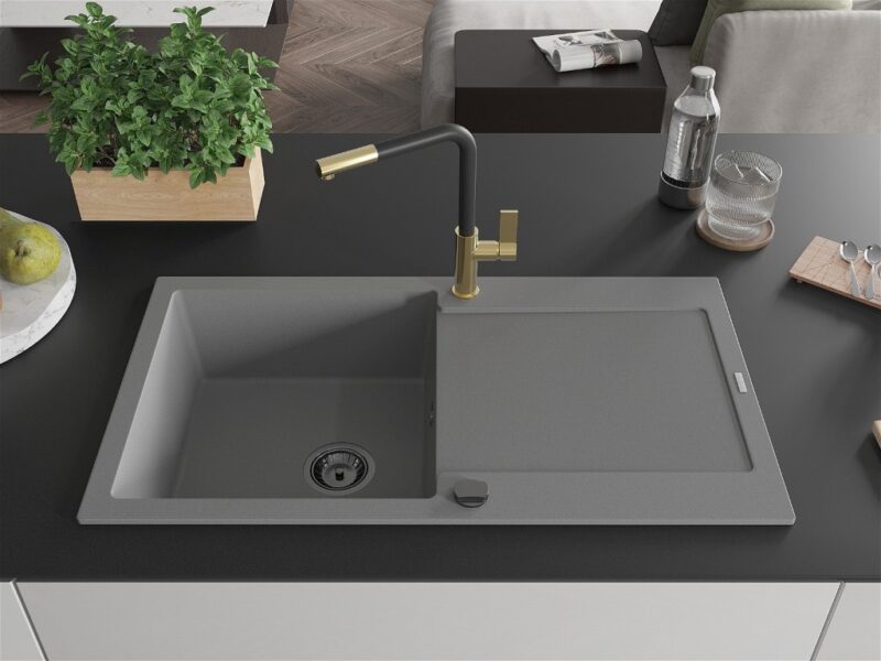 Technické dáta: drez: Rozmer: 900x500x190mm Hĺbka komory: 180 mm Rozmery komory: 430×415 mm Priemer odtoku: ø90 mm Typ: 1-miska s odkvapkávačom Typ: Zapustené do pracovnej dosky Šedá farba Povrchová úprava sifónu: čierna Materiál: žula (80% žulové kamenivo, 20% živice) Prepadový otvor: Áno Otvory: (batérie, automatické) 2 Inštalácia: Univerzálna, je možné inštalovať s odkvapkávačom na ľavú alebo pravú stranu Vysoká odolnosť proti poškriabaniu a zmene farby Odolnosť proti tepelným šokom Ľahko čistiteľný povrch Dva dodatočné vyfrézované otvory na samodierovanie ø35 kuchynská batéria: Materiál: mosadz Farba: Zlatá/Čierna Hlava: Keramická Prevzdušňovač: Áno Typ: Jedna páka Rozsah výtoku: 245 mm Výška batérie: 307 mm(GT) Ean: 5905315056153