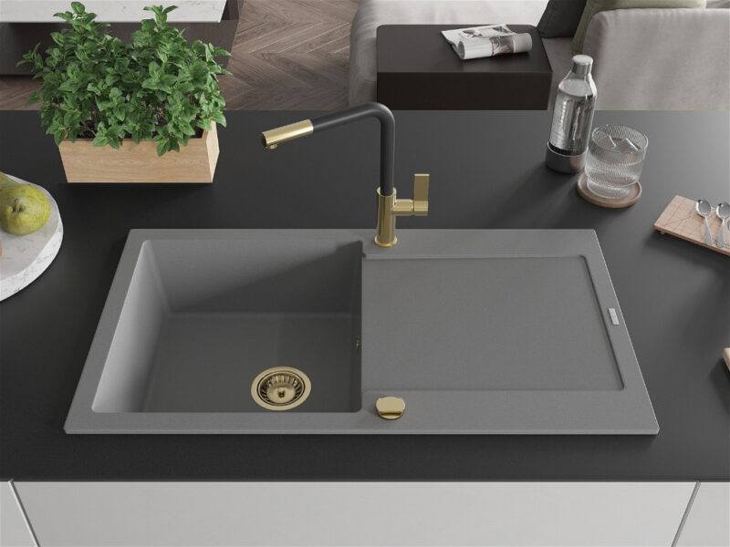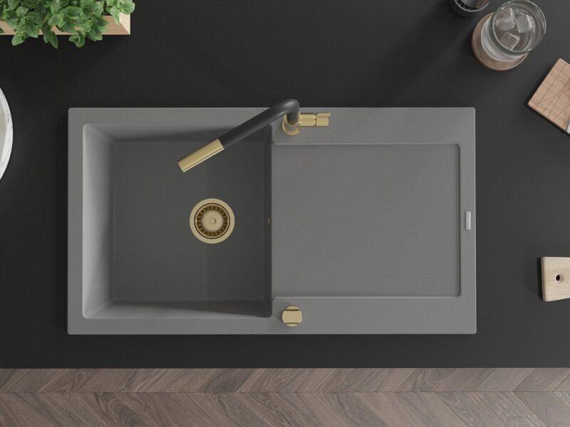 Technické dáta: drez: Rozmer: 900x500x190mm Hĺbka komory: 180 mm Rozmery komory: 430×415 mm Priemer odtoku: ø90 mm Typ: 1-miska s odkvapkávačom Typ: Zapustené do pracovnej dosky Šedá farba Povrchová úprava sifónu: zlatá Materiál: žula (80% žulové kamenivo, 20% živice) Prepadový otvor: Áno Otvory: (batérie, automatické) 2 Inštalácia: Univerzálna, je možné inštalovať s odkvapkávačom na ľavú alebo pravú stranu Vysoká odolnosť proti poškriabaniu a zmene farby Odolnosť proti tepelným šokom Ľahko čistiteľný povrch Dva dodatočné vyfrézované otvory na samodierovanie ø35 kuchynská batéria: Materiál: mosadz Farba: Zlatá/Čierna Hlava: Keramická Prevzdušňovač: Áno Typ: Jedna páka Rozsah výtoku: 245 mm Výška batérie: 307 mm(GT) Ean: 5905315056146