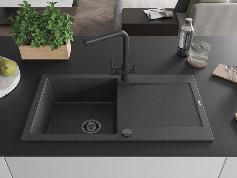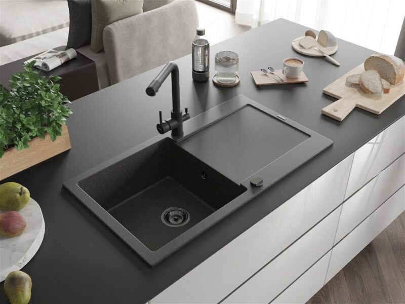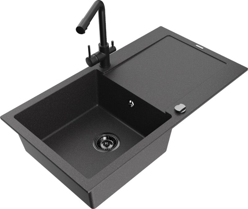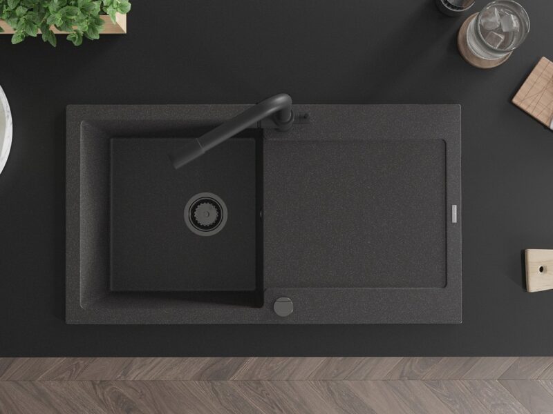 Technické dáta: drez: Rozmer: 900x500x190mm Hĺbka komory: 180 mm Rozmery komory: 430×415 mm Priemer odtoku: ø90 mm Typ: 1-miska s odkvapkávačom Typ: Zapustené do pracovnej dosky Farba: Škvrnitá čierna Povrchová úprava sifónu: čierna Materiál: žula (80% žulové kamenivo, 20% živice) Prepadový otvor: Áno Otvory: (batérie, automatické) 2 Inštalácia: Univerzálna, je možné inštalovať s odkvapkávačom na ľavú alebo pravú stranu Vysoká odolnosť proti poškriabaniu a zmene farby Odolnosť proti tepelným šokom Ľahko čistiteľný povrch Dva dodatočné vyfrézované otvory na samodierovanie ø35 kuchynská batéria: Materiál: mosadz Čierna farba Hlava: Keramická Prevzdušňovač: Áno Rozsah výtoku: 235 mm Výška batérie: 315 mm Typ: Dve rukoväte Dvojhlavá batéria s prídavným kanálom pre filtrovanú pitnú vodu(GT) Ean: 5905315022264