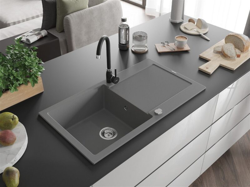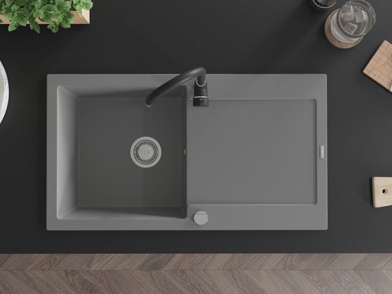 Technické dáta: drez: Rozmer: 900x500x190mm Hĺbka komory: 180 mm Rozmery komory: 430×415 mm Priemer odtoku: ø90 mm Typ: 1-miska s odkvapkávačom Typ: Zapustené do pracovnej dosky Šedá farba Povrchová úprava sifónu: Chrome Materiál: žula (80% žulové kamenivo, 20% živice) Prepadový otvor: Áno Otvory: (batérie, automatické) 2 Inštalácia: Univerzálna, je možné inštalovať s odkvapkávačom na ľavú alebo pravú stranu Vysoká odolnosť proti poškriabaniu a zmene farby Odolnosť proti tepelným šokom Ľahko čistiteľný povrch Dva dodatočné vyfrézované otvory na samodierovanie ø35 kuchynská batéria: Materiál: mosadz Čierna farba Hlava: Keramická Prevzdušňovač: Áno Typ: Jedna páka Výška batérie: 335 mm Rozsah výtoku: 180 mm(GT) Ean: 5905315013781