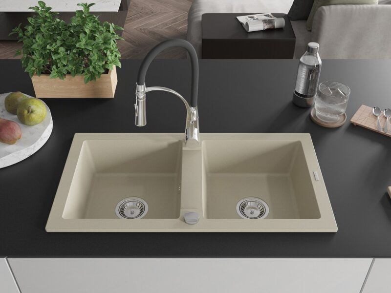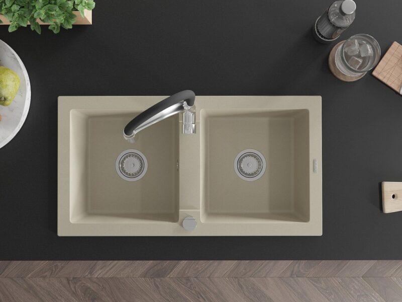 Technické dáta: drez: Rozmer: 820 x 436 x 161 mm Hĺbka komory: 151 mm Rozmery komory: 356×336 mm Priemer odtoku: ø90 mm Typ: 2-komorový Typ: Zapustené do pracovnej dosky Farba béžová Povrchová úprava sifónu: Chrome Materiál: žula (80% žulové kamenivo, 20% živice) Prepadový otvor: Áno Otvory: (batérie, automatické) 2 Vysoká odolnosť proti poškriabaniu a zmene farby Odolnosť proti tepelným šokom Ľahko čistiteľný povrch kuchynská batéria: Materiál: mosadz Farba: chróm/čierna Hlava: Keramická Prevzdušňovač: Áno Typ: Jedna páka Výška batérie: 430 mm Rozsah výtoku: 185 mm Batéria má výsuvný výtok(GT) Ean: 5905315043849