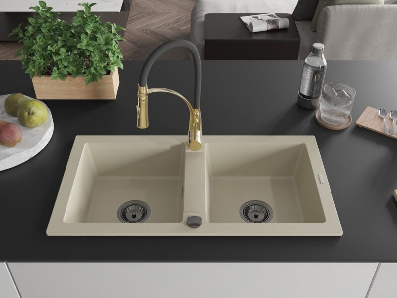 Technické dáta: drez: Rozmer: 820 x 436 x 161 mm Hĺbka komory: 151 mm Rozmery komory: 356×336 mm Priemer odtoku: ø90 mm Typ: 2-komorový Typ: Zapustené do pracovnej dosky Farba béžová Povrchová úprava sifónu: čierna Materiál: žula (80% žulové kamenivo, 20% živice) Prepadový otvor: Áno Otvory: (batérie, automatické) 2 Vysoká odolnosť proti poškriabaniu a zmene farby Odolnosť proti tepelným šokom Ľahko čistiteľný povrch kuchynská batéria: Materiál: mosadz Farba: Zlatá/Čierna Hlava: Keramická Prevzdušňovač: Áno Typ: Jedna páka Výška batérie: 430 mm Rozsah výtoku: 185 mm Batéria má výsuvný výtok(GT) Ean: 5905315043870