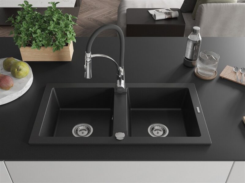 Technické dáta: drez: Rozmer: 820 x 436 x 161 mm Hĺbka komory: 151 mm Rozmery komory: 356×336 mm Priemer odtoku: ø90 mm Typ: 2-komorový Typ: Zapustené do pracovnej dosky Čierna farba Povrchová úprava sifónu: Chrome Materiál: žula (80% žulové kamenivo, 20% živice) Prepadový otvor: Áno Otvory: (batérie, automatické) 2 Vysoká odolnosť proti poškriabaniu a zmene farby Odolnosť proti tepelným šokom Ľahko čistiteľný povrch kuchynská batéria: Materiál: mosadz Farba: chróm/čierna Hlava: Keramická Prevzdušňovač: Áno Typ: Jedna páka Výška batérie: 430 mm Rozsah výtoku: 185 mm Batéria má výsuvný výtok(GT) Ean: 5905315044143