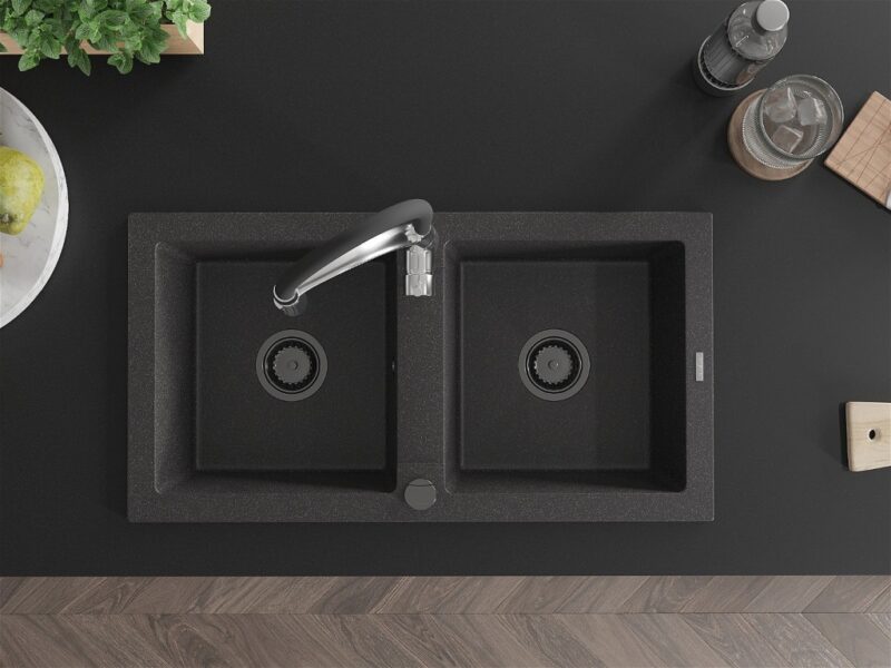 Technické dáta: drez: Rozmer: 820 x 436 x 161 mm Hĺbka komory: 151 mm Rozmery komory: 356×336 mm Priemer odtoku: ø90 mm Typ: 2-komorový Typ: Zapustené do pracovnej dosky Farba: Škvrnitá čierna Povrchová úprava sifónu: čierna Materiál: žula (80% žulové kamenivo, 20% živice) Prepadový otvor: Áno Otvory: (batérie, automatické) 2 Vysoká odolnosť proti poškriabaniu a zmene farby Odolnosť proti tepelným šokom Ľahko čistiteľný povrch kuchynská batéria: Materiál: mosadz Farba: chróm/čierna Hlava: Keramická Prevzdušňovač: Áno Typ: Jedna páka Výška batérie: 430 mm Rozsah výtoku: 185 mm Batéria má výsuvný výtok(GT) Ean: 5905315044099