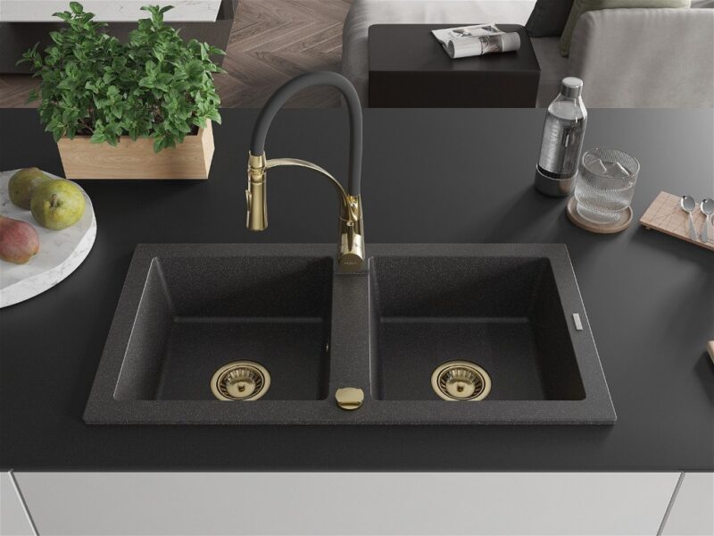 Technické dáta: drez: Rozmer: 820 x 436 x 161 mm Hĺbka komory: 151 mm Rozmery komory: 356×336 mm Priemer odtoku: ø90 mm Typ: 2-komorový Typ: Zapustené do pracovnej dosky Farba: Škvrnitá čierna Povrchová úprava sifónu: zlatá Materiál: žula (80% žulové kamenivo, 20% živice) Prepadový otvor: Áno Otvory: (batérie, automatické) 2 Vysoká odolnosť proti poškriabaniu a zmene farby Odolnosť proti tepelným šokom Ľahko čistiteľný povrch kuchynská batéria: Materiál: mosadz Farba: Zlatá/Čierna Hlava: Keramická Prevzdušňovač: Áno Typ: Jedna páka Výška batérie: 430 mm Rozsah výtoku: 185 mm Batéria má výsuvný výtok(GT) Ean: 5905315044105