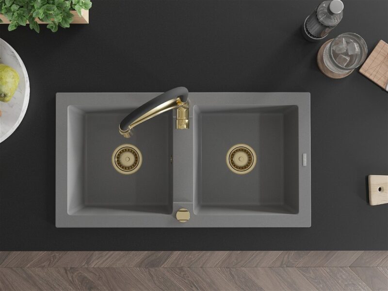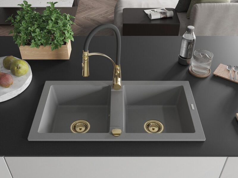 Technické dáta: drez: Rozmer: 820 x 436 x 161 mm Hĺbka komory: 151 mm Rozmery komory: 356×336 mm Priemer odtoku: ø90 mm Typ: 2-komorový Typ: Zapustené do pracovnej dosky Šedá farba Povrchová úprava sifónu: zlatá Materiál: žula (80% žulové kamenivo, 20% živice) Prepadový otvor: Áno Otvory: (batérie, automatické) 2 Vysoká odolnosť proti poškriabaniu a zmene farby Odolnosť proti tepelným šokom Ľahko čistiteľný povrch kuchynská batéria: Materiál: mosadz Farba: Zlatá/Čierna Hlava: Keramická Prevzdušňovač: Áno Typ: Jedna páka Výška batérie: 430 mm Rozsah výtoku: 185 mm Batéria má výsuvný výtok(GT) Ean: 5905315043924