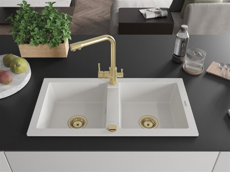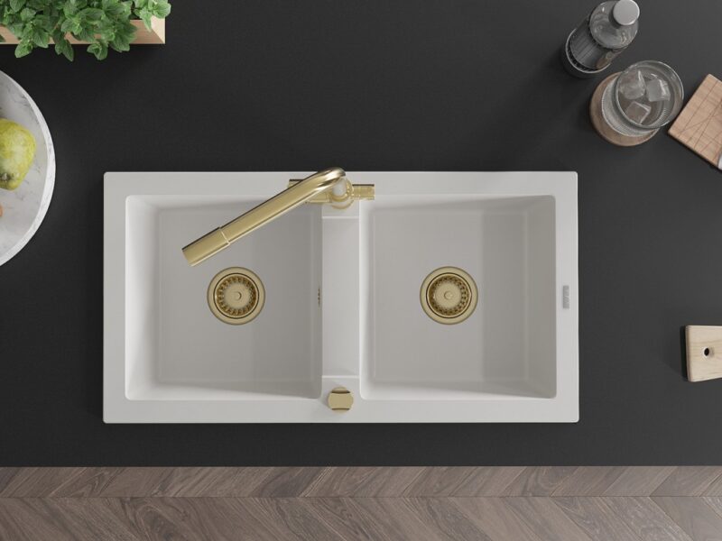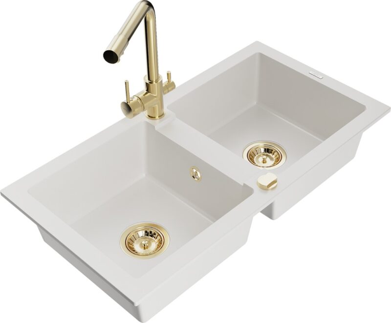 Technické dáta: drez: Rozmer: 820 x 436 x 161 mm Hĺbka komory: 151 mm Rozmery komory: 356×336 mm Priemer odtoku: ø90 mm Typ: 2-komorový Typ: Zapustené do pracovnej dosky biela farba Povrchová úprava sifónu: zlatá Materiál: žula (80% žulové kamenivo, 20% živice) Prepadový otvor: Áno Otvory: (batérie, automatické) 2 Vysoká odolnosť proti poškriabaniu a zmene farby Odolnosť proti tepelným šokom Ľahko čistiteľný povrch kuchynská batéria: Materiál: mosadz Farba: Zlatá Hlava: Keramická Prevzdušňovač: Áno Typ: Dve rukoväte Rozsah výtoku: 235 mm Výška batérie: 315 mm Dvojhlavá batéria s prídavným kanálom pre filtrovanú pitnú vodu(GT) Ean: 5905315022998