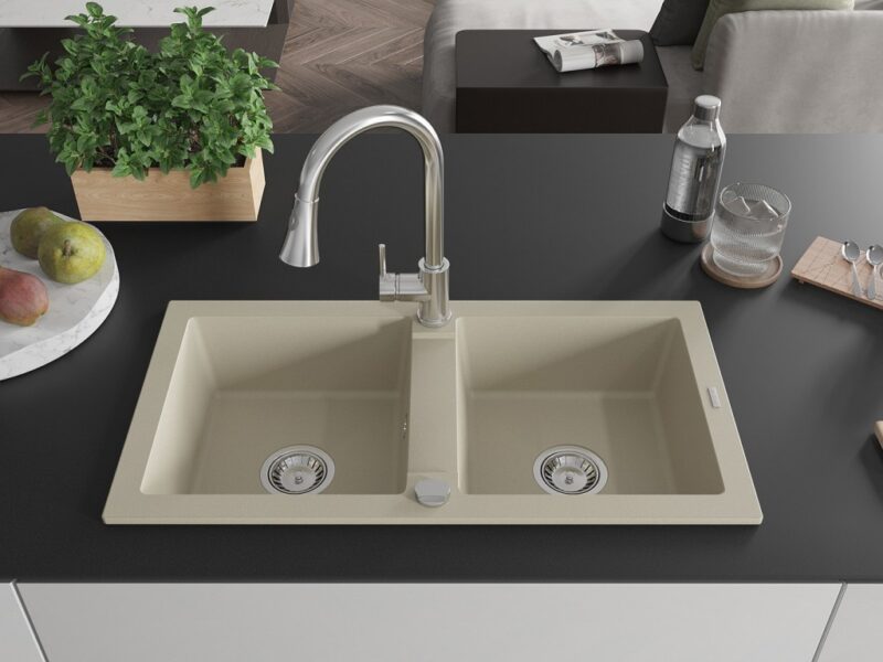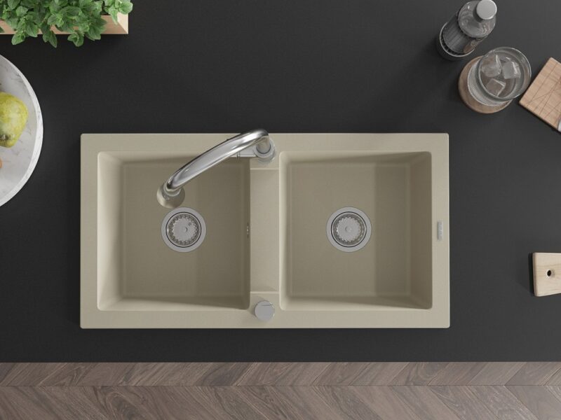 Technické dáta: drez: Rozmer: 820 x 436 x 161 mm Hĺbka komory: 151 mm Rozmery komory: 356×336 mm Priemer odtoku: ø90 mm Typ: 2-komorový Typ: Zapustené do pracovnej dosky Farba béžová Povrchová úprava sifónu: Chrome Materiál: žula (80% žulové kamenivo, 20% živice) Prepadový otvor: Áno Otvory: (batérie, automatické) 2 Vysoká odolnosť proti poškriabaniu a zmene farby Odolnosť proti tepelným šokom Ľahko čistiteľný povrch kuchynská batéria: Materiál: mosadz Farba: Chrome Hlava: Keramická Prevzdušňovač: Áno Typ: Jedna páka Výška batérie: 380 mm Rozsah výtoku: 252 mm Typ výtoku: Výsuvný(GT) Ean: 5905315028129
