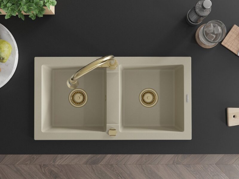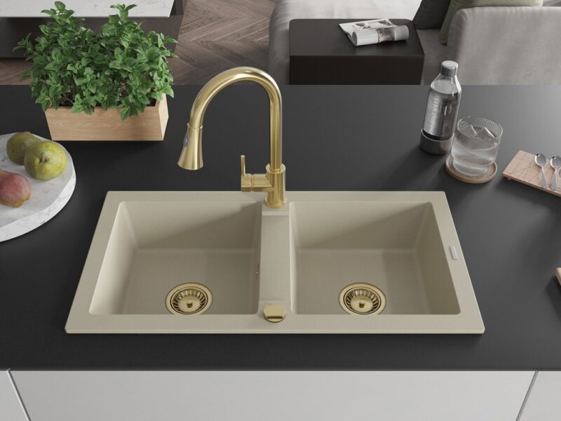 Technické dáta: drez: Rozmer: 820 x 436 x 161 mm Hĺbka komory: 151 mm Rozmery komory: 356×336 mm Priemer odtoku: ø90 mm Typ: 2-komorový Typ: Zapustené do pracovnej dosky Farba béžová Povrchová úprava sifónu: zlatá Materiál: žula (80% žulové kamenivo, 20% živice) Prepadový otvor: Áno Otvory: (batérie, automatické) 2 Vysoká odolnosť proti poškriabaniu a zmene farby Odolnosť proti tepelným šokom Ľahko čistiteľný povrch kuchynská batéria: Materiál: mosadz Farba: Zlatá Hlava: Keramická Prevzdušňovač: Áno Typ: Jedna páka Výška batérie: 380 mm Rozsah výtoku: 252 mm Typ výtoku: Výsuvný(GT) Ean: 5905315028143