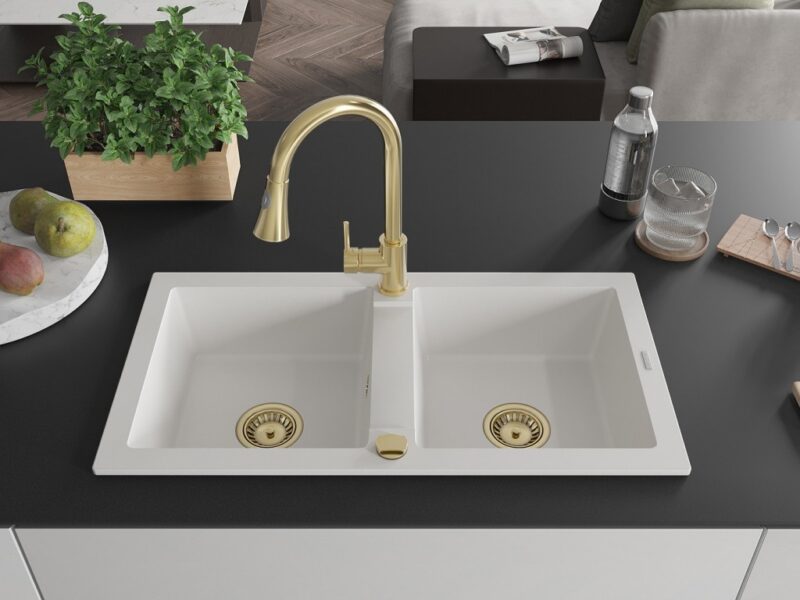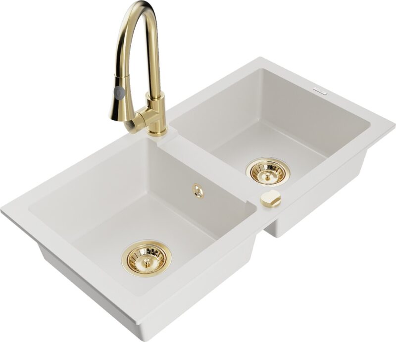 Technické dáta: drez: Rozmer: 820 x 436 x 161 mm Hĺbka komory: 151 mm Rozmery komory: 356×336 mm Priemer odtoku: ø90 mm Typ: 2-komorový Typ: Zapustené do pracovnej dosky biela farba Povrchová úprava sifónu: zlatá Materiál: žula (80% žulové kamenivo, 20% živice) Prepadový otvor: Áno Otvory: (batérie, automatické) 2 Vysoká odolnosť proti poškriabaniu a zmene farby Odolnosť proti tepelným šokom Ľahko čistiteľný povrch kuchynská batéria: Materiál: mosadz Farba: Zlatá Hlava: Keramická Prevzdušňovač: Áno Typ: Jedna páka Výška batérie: 380 mm Rozsah výtoku: 252 mm Typ výtoku: Výsuvný(GT) Ean: 5905315028105