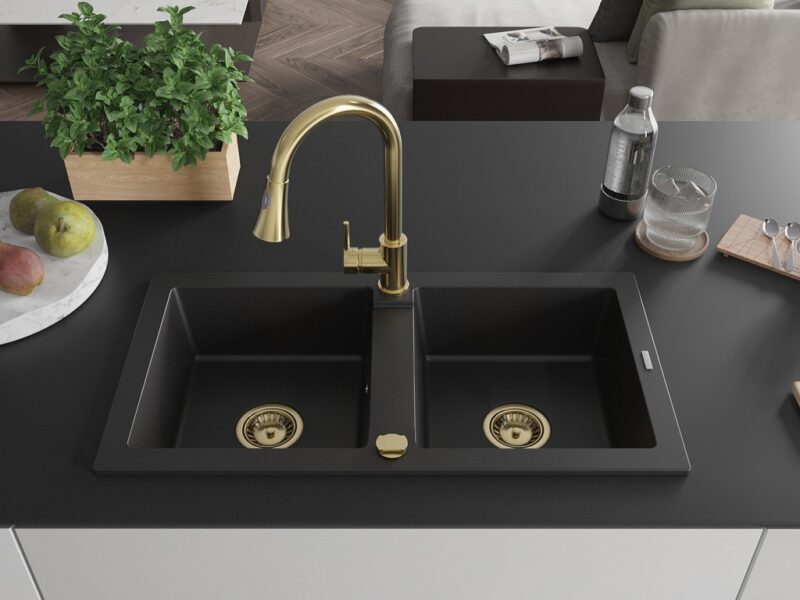 Technické dáta: drez: Rozmer: 820 x 436 x 161 mm Hĺbka komory: 151 mm Rozmery komory: 356×336 mm Priemer odtoku: ø90 mm Typ: 2-komorový Typ: Zapustené do pracovnej dosky Čierna farba Povrchová úprava sifónu: zlatá Materiál: žula (80% žulové kamenivo, 20% živice) Prepadový otvor: Áno Otvory: (batérie, automatické) 2 Vysoká odolnosť proti poškriabaniu a zmene farby Odolnosť proti tepelným šokom Ľahko čistiteľný povrch kuchynská batéria: Materiál: mosadz Farba: Zlatá Hlava: Keramická Prevzdušňovač: Áno Typ: Jedna páka Výška batérie: 380 mm Rozsah výtoku: 252 mm Typ výtoku: Výsuvný(GT) Ean: 5905315028365