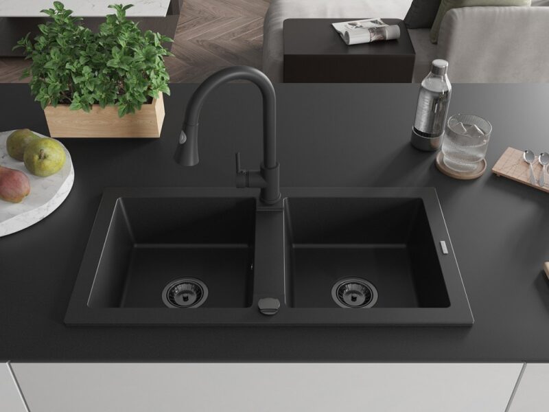 Technické dáta: drez: Rozmer: 820 x 436 x 161 mm Hĺbka komory: 151 mm Rozmery komory: 356×336 mm Priemer odtoku: ø90 mm Typ: 2-komorový Typ: Zapustené do pracovnej dosky Čierna farba Povrchová úprava sifónu: čierna Materiál: žula (80% žulové kamenivo, 20% živice) Prepadový otvor: Áno Otvory: (batérie, automatické) 2 Vysoká odolnosť proti poškriabaniu a zmene farby Odolnosť proti tepelným šokom Ľahko čistiteľný povrch kuchynská batéria: Materiál: mosadz Čierna farba Hlava: Keramická Prevzdušňovač: Áno Typ: Jedna páka Výška batérie: 380 mm Rozsah výtoku: 252 mm Typ výtoku: Výsuvný(GT) Ean: 5905315028396