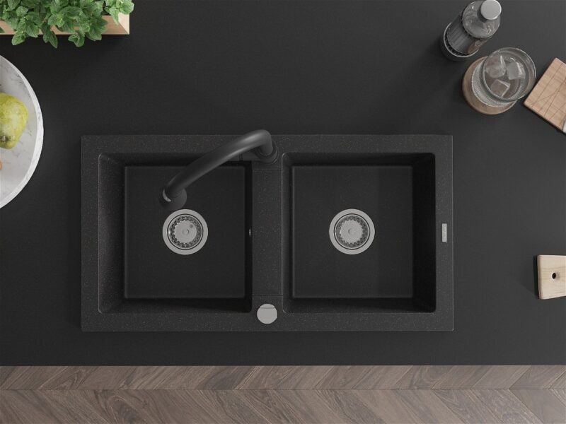 MEXEN/S MEXEN/S – Mario granitový drez 2-bowl vrátane batérie Elia, čierna/strieborná metalík 6504-73-670101-70