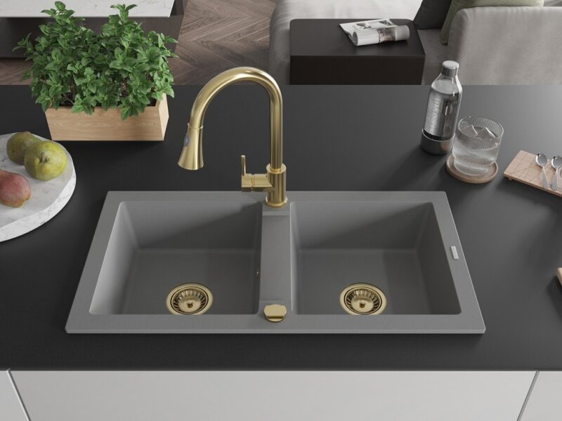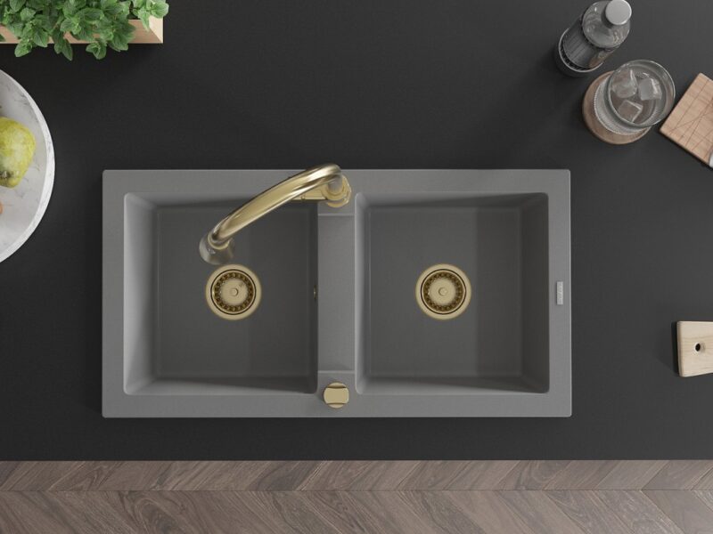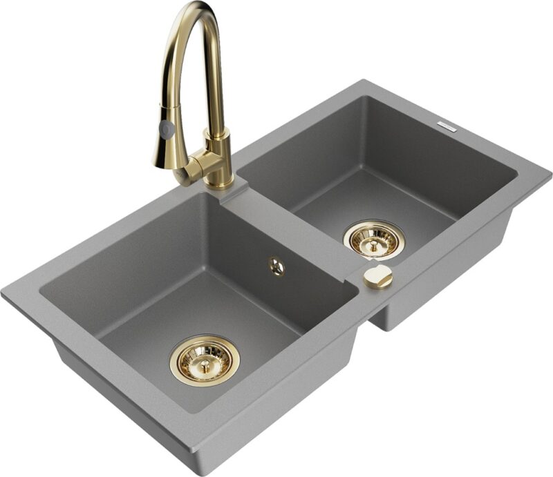Technické dáta: drez: Rozmer: 820 x 436 x 161 mm Hĺbka komory: 151 mm Rozmery komory: 356×336 mm Priemer odtoku: ø90 mm Typ: 2-komorový Typ: Zapustené do pracovnej dosky Šedá farba Povrchová úprava sifónu: zlatá Materiál: žula (80% žulové kamenivo, 20% živice) Prepadový otvor: Áno Otvory: (batérie, automatické) 2 Vysoká odolnosť proti poškriabaniu a zmene farby Odolnosť proti tepelným šokom Ľahko čistiteľný povrch kuchynská batéria: Materiál: mosadz Farba: Zlatá Hlava: Keramická Prevzdušňovač: Áno Typ: Jedna páka Výška batérie: 380 mm Rozsah výtoku: 252 mm Typ výtoku: Výsuvný(GT) Ean: 5905315028174