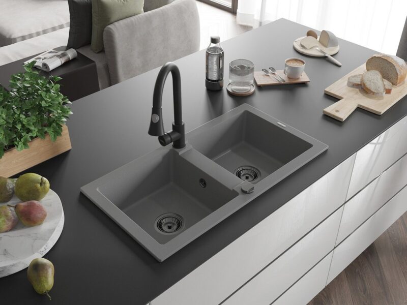 Technické dáta: drez: Rozmer: 820 x 436 x 161 mm Hĺbka komory: 151 mm Rozmery komory: 356×336 mm Priemer odtoku: ø90 mm Typ: 2-komorový Typ: Zapustené do pracovnej dosky Šedá farba Povrchová úprava sifónu: čierna Materiál: žula (80% žulové kamenivo, 20% živice) Prepadový otvor: Áno Otvory: (batérie, automatické) 2 Vysoká odolnosť proti poškriabaniu a zmene farby Odolnosť proti tepelným šokom Ľahko čistiteľný povrch kuchynská batéria: Materiál: mosadz Čierna farba Hlava: Keramická Prevzdušňovač: Áno Typ: Jedna páka Výška batérie: 380 mm Rozsah výtoku: 252 mm Typ výtoku: Výsuvný(GT) Ean: 5905315028198
