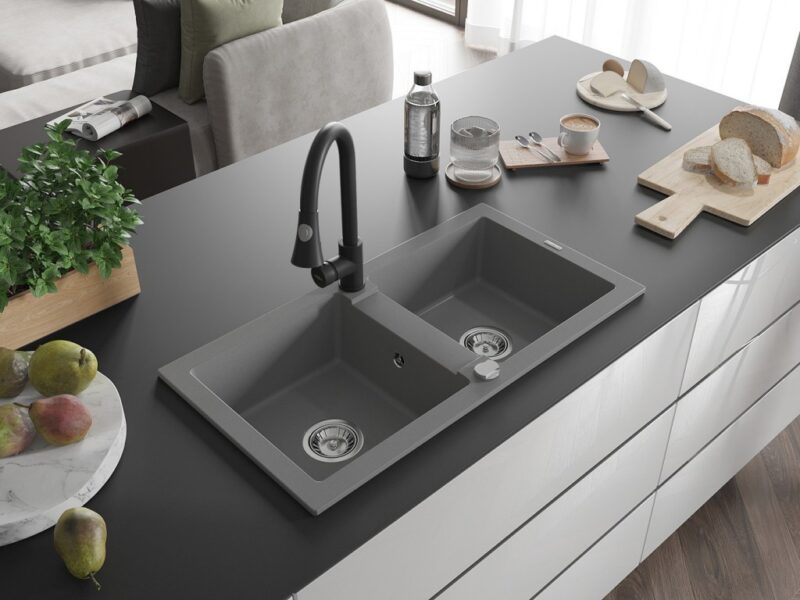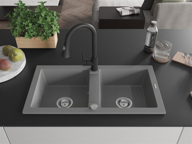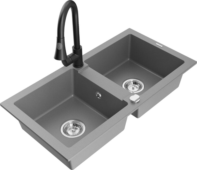 Technické dáta: drez: Rozmer: 820 x 436 x 161 mm Hĺbka komory: 151 mm Rozmery komory: 356×336 mm Priemer odtoku: ø90 mm Typ: 2-komorový Typ: Zapustené do pracovnej dosky Šedá farba Povrchová úprava sifónu: Chrome Materiál: žula (80% žulové kamenivo, 20% živice) Prepadový otvor: Áno Otvory: (batérie, automatické) 2 Vysoká odolnosť proti poškriabaniu a zmene farby Odolnosť proti tepelným šokom Ľahko čistiteľný povrch kuchynská batéria: Materiál: mosadz Čierna farba Hlava: Keramická Prevzdušňovač: Áno Typ: Jedna páka Výška batérie: 380 mm Rozsah výtoku: 252 mm Typ výtoku: Výsuvný(GT) Ean: 5905315028181
