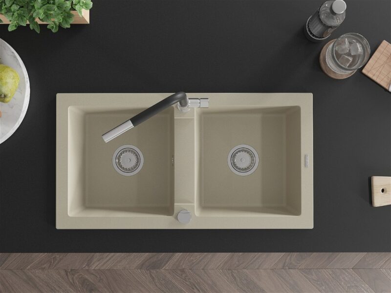 MEXEN/S MEXEN/S – Mario granitový drez 2-bowl vrátane batérie Flora, béžová 6504-69-670401-07