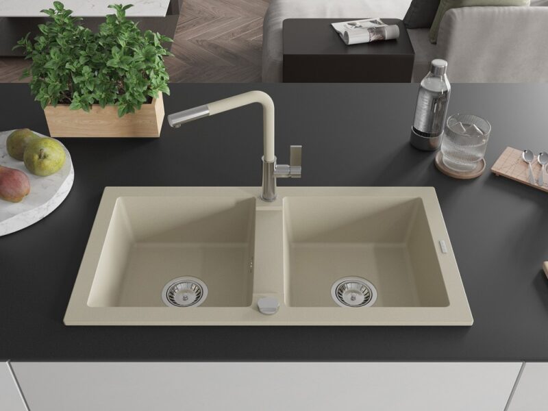 Technické dáta: drez: Rozmer: 820 x 436 x 161 mm Hĺbka komory: 151 mm Rozmery komory: 356×336 mm Priemer odtoku: ø90 mm Typ: 2-komorový Typ: Zapustené do pracovnej dosky Farba béžová Povrchová úprava sifónu: Chrome Materiál: žula (80% žulové kamenivo, 20% živice) Prepadový otvor: Áno Otvory: (batérie, automatické) 2 Vysoká odolnosť proti poškriabaniu a zmene farby Odolnosť proti tepelným šokom Ľahko čistiteľný povrch kuchynská batéria: Materiál: mosadz Farba: chróm/béžová Hlava: Keramická Prevzdušňovač: Áno Typ: Jedna páka Rozsah výtoku: 245 mm Výška batérie: 307 mm(GT) Ean: 5905315057563