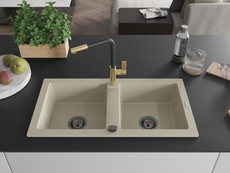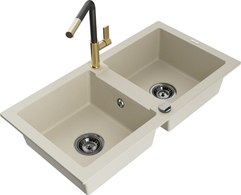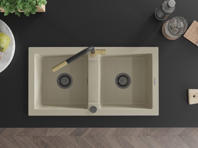 Technické dáta: drez: Rozmer: 820 x 436 x 161 mm Hĺbka komory: 151 mm Rozmery komory: 356×336 mm Priemer odtoku: ø90 mm Typ: 2-komorový Typ: Zapustené do pracovnej dosky Farba béžová Povrchová úprava sifónu: čierna Materiál: žula (80% žulové kamenivo, 20% živice) Prepadový otvor: Áno Otvory: (batérie, automatické) 2 Vysoká odolnosť proti poškriabaniu a zmene farby Odolnosť proti tepelným šokom Ľahko čistiteľný povrch kuchynská batéria: Materiál: mosadz Farba: Zlatá/Čierna Hlava: Keramická Prevzdušňovač: Áno Typ: Jedna páka Rozsah výtoku: 245 mm Výška batérie: 307 mm(GT) Ean: 5905315057587